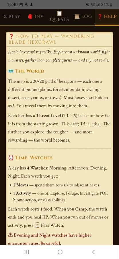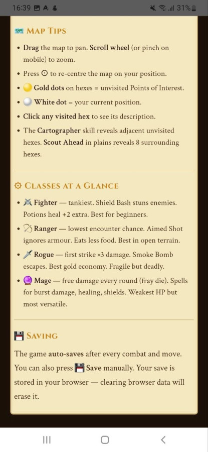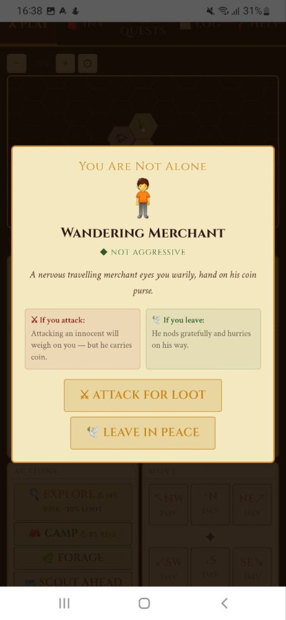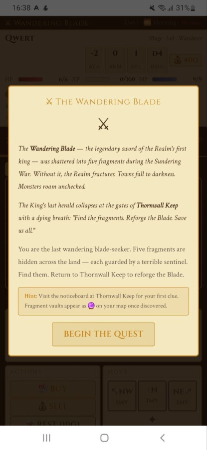Погрузитесь в атмосферу классических приключений с The Wandering Blade — браузерной RPG в формате гекс-исследования, где каждое решение меняет судьбу героя. Исследуйте процедурно генерируемый мир, полный тайн, опасностей и редких находок. Выберите свой путь — от хитрого разбойника до могущественного мага — и отправляйтесь на поиски фрагментов легендарного клинка. Тактические бои, свобода действий и живой мир делают каждое прохождение уникальным. Играйте в любое время — прямо в браузере, без ограничений.