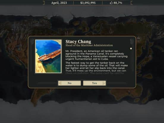 Геймплей у игры плох,по этому не ожидайте от нее что то шедевральное,на любителя,поэтому игра может со временем надоесть.И да игра является Сатирической Пародией Современного и Реального Мира,поэтому некоторые игровые персонажи могут быть похожи по характеру на некоторых реальных персонажей,как минимум у вашего предшественника характер чем то похож на Трампа,да и сам он выглядит как смесь Трампа и Байдена.Сюжет Довольно Хорош,со своими сюжетными поворотами,целями и персонажами.Графика понравилась со своей стилистикой.Управление интуитивно понятна.Играть в игру можно только ради Сюжета и Графической Стилистики(И то она будет только в основую часть времени присутствовать на кат-сценах и на вашей президентской речи)