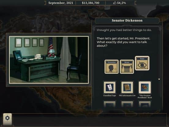 This Is the President - Вы теперь новый президент США, который принял пост в 2020 году. Но из-за своей прошлой жизни нечестного человека вы боитесь, что можете столкнуться с судом. Для избежания этого, вам нужно убедить Конгресс принять Поправку 28, именно она дает президенту иммунитет на всю жизнь. В то же время вы должны командовать всем персоналом для решения скопившихся проблем. Вам придется бороться с завистниками, истеблишментом, настоящими конкурентами и СМИ, и, конечно же, действовать в интересах США на международной арене. Вашей главной задачей будет изменение Конституции США, но для этого вам придется убеждать, шантажировать, подкупать и запугивать часть политической системы.