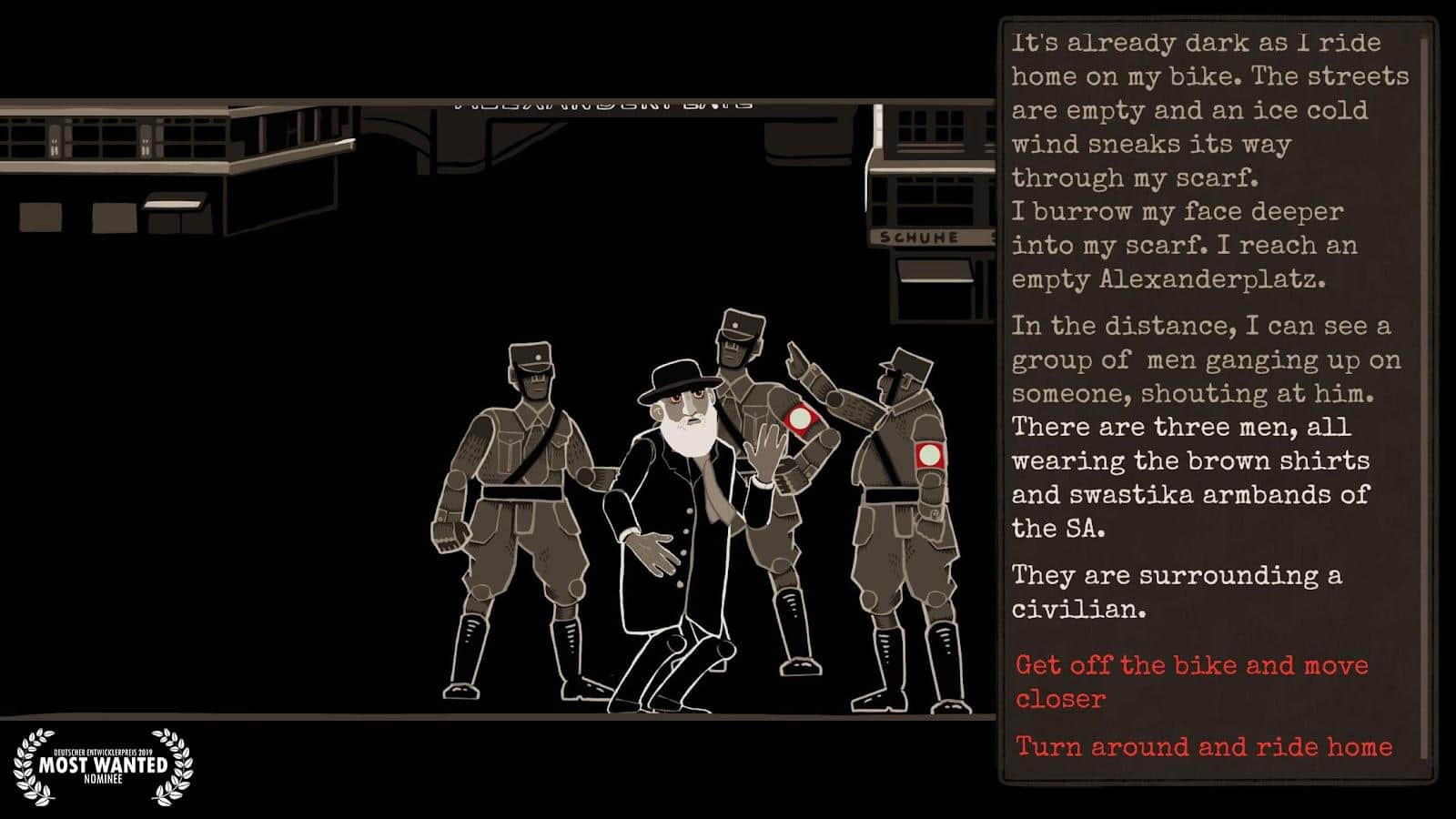 Through the Darkest of Times — игра в жанре исторической стратегии на Android, которая посвящена движению сопротивления в самый мрачный период истории и обычной жизни простых людей Третьего рейха. Историческая точность означает, что ваша небольшая группа не изменит исхода войны — и не предотвратит всех нацистских зверств. Однако вы сможете сделать все, чтобы спасти как можно больше жизней и противостоять системе при любой возможности. 1933 год, Берлин. Вы лидер небольшой группы сопротивления, в которую входят самые обычные люди — евреи и католики, коммунисты и патриоты, — которые не могут закрыть глаза на происходящее. Ваша задача — наносить режиму крохотные удары: разбрасывать листовки, чтобы рассказать людям, что нацисты творят на самом деле; писать послания на стенах; устраивать диверсии; добывать информацию и набирать новых соратников. И при этом не выдавать себя: если режим узнает о вашей группе, жизнь каждого ее участника окажется в опасности.