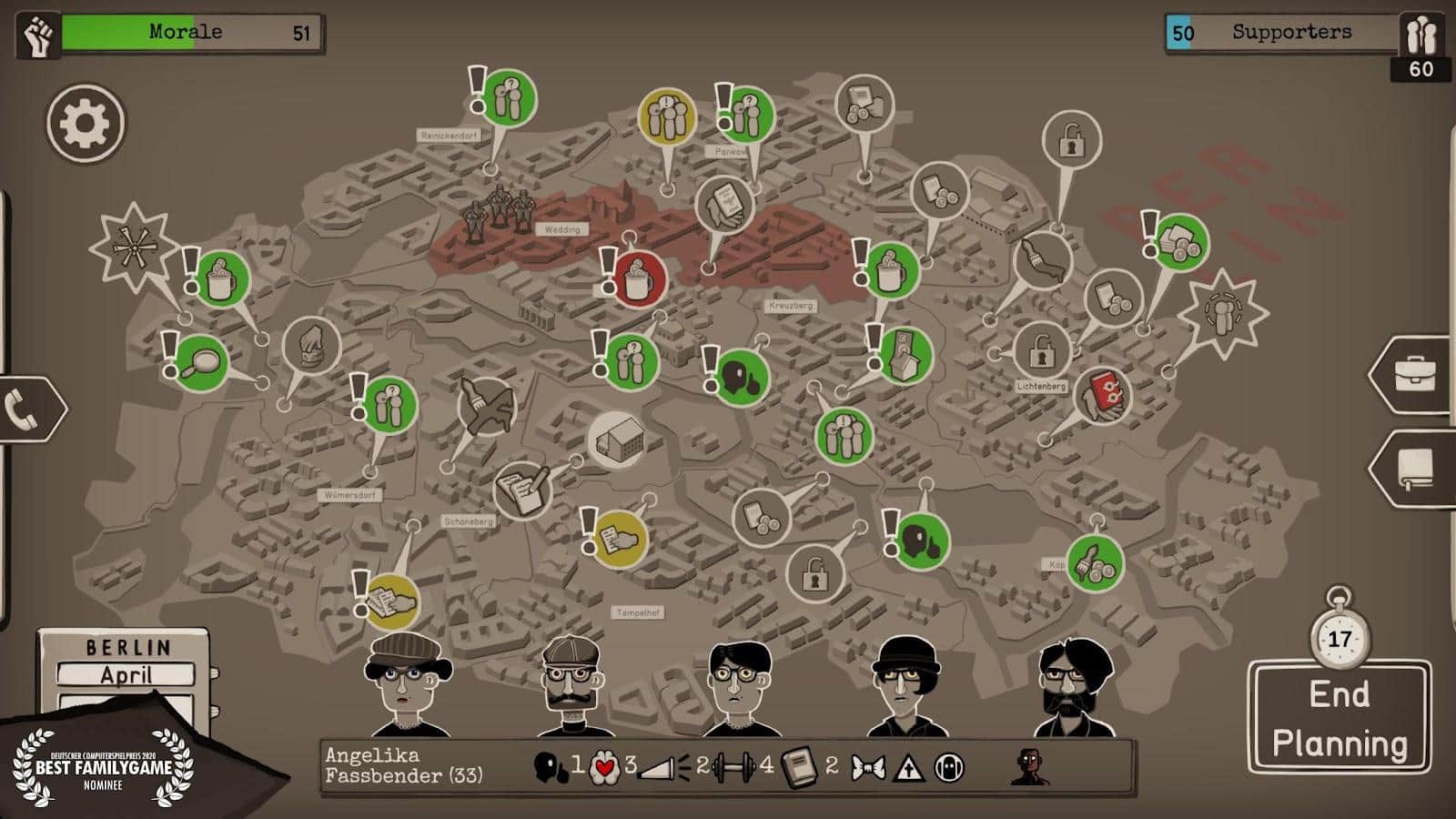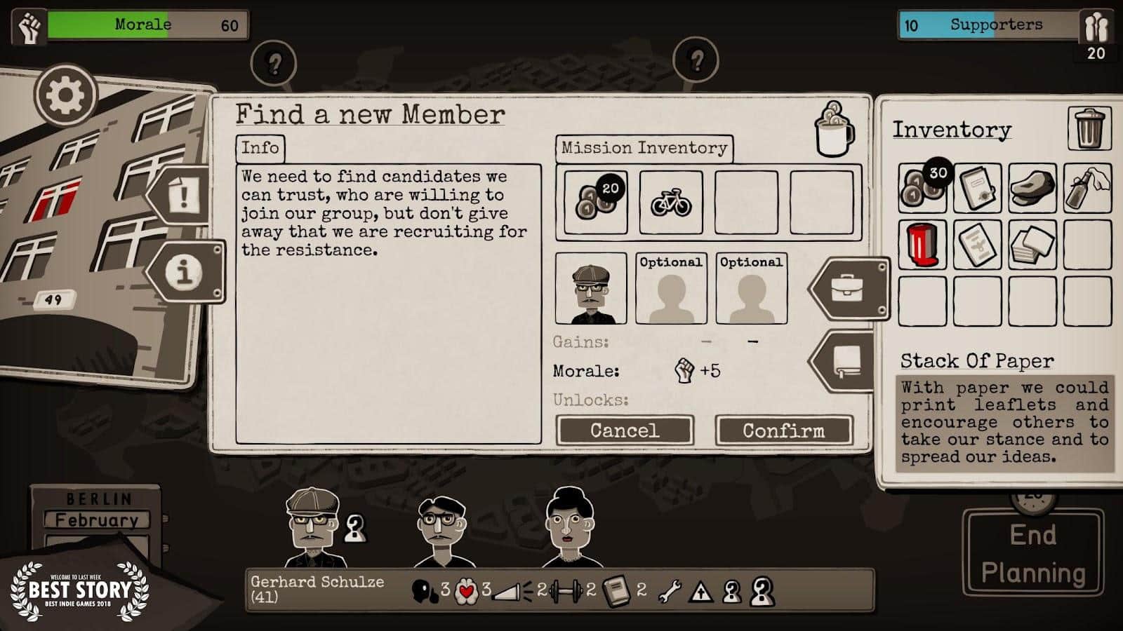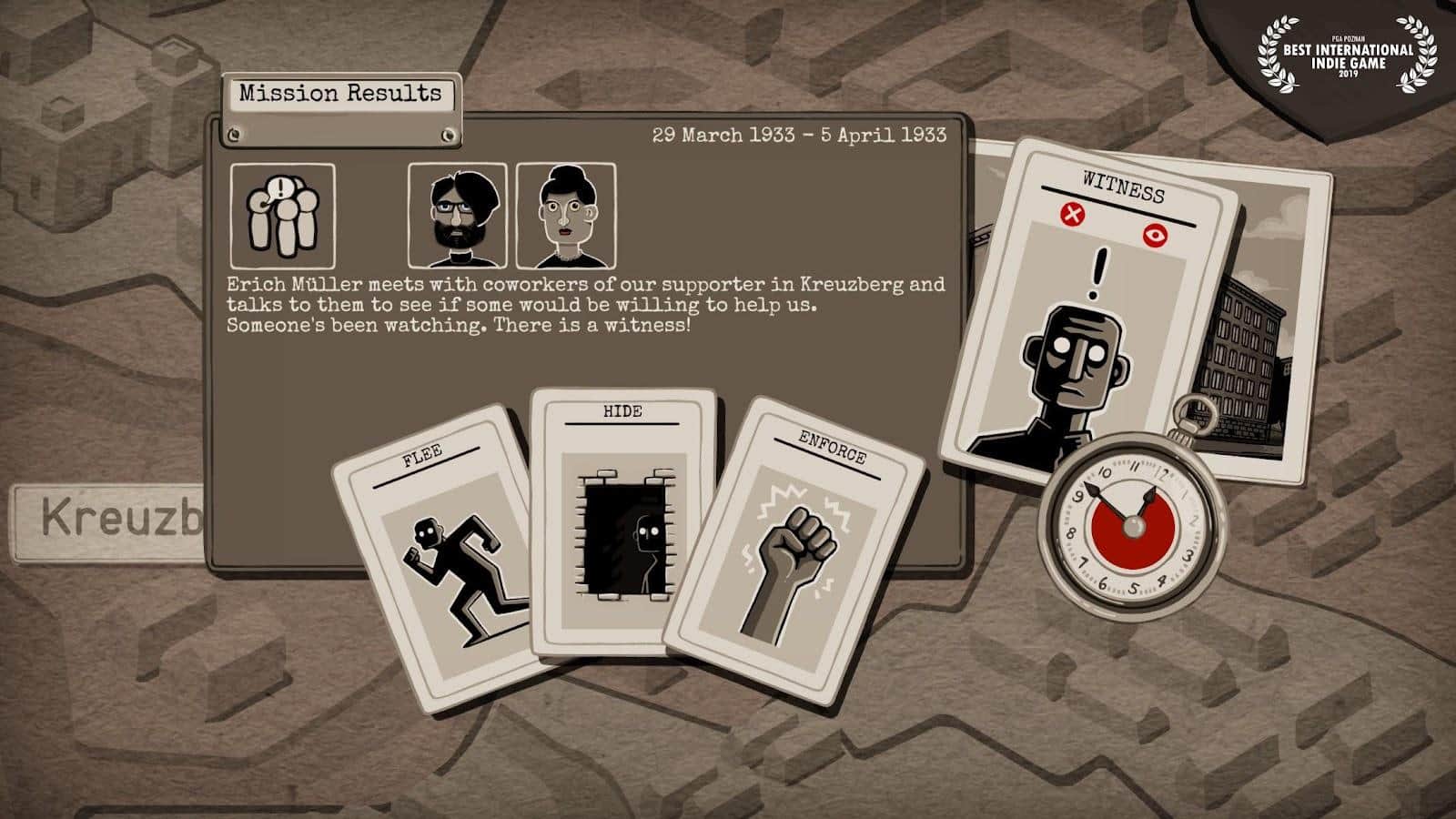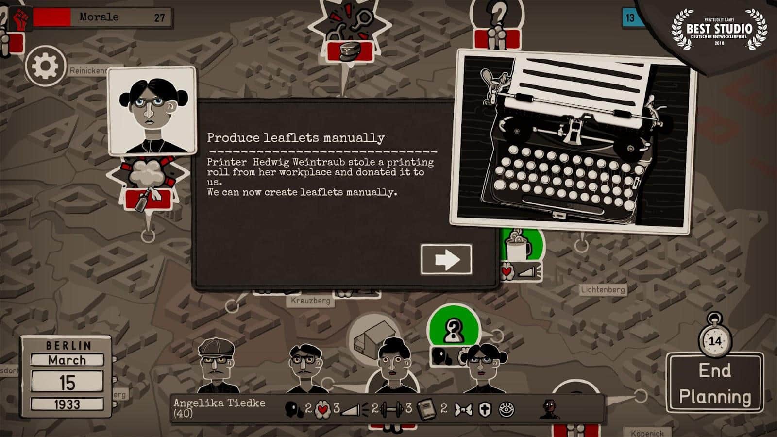 Классная игра. Мы очередная жертва проклятого Гитлера. Трое друзей которые подвергнуты такой же беде решают основать группу таких же партизан. Но всё равно чё то наш главный герой в этой группе альфа-самец. Назначаем членов группы: от попрошайничества у работяг заводских или (с определёнными предметами) устраиваем настоящий терракт! А самое прикольное что у всех людей есть свои политические взгляды и умения. Например один не переносит насилия. А второй с радостью замочит парочку полицейских с дедовой винтовки. То есть те, которые не переносят насилия хорошо подходят для дипломатии. А жестокие парни для спасения заложников, короче боевых операций. А ещё партия влияет на навык дипломатии. Если ты отправил коммуниста собирать дань с работяг то шанс на более высокий куш возрастает. А если этого же коммуниста отправить к священникам и у него не вкачан навык дипломатии и агитации то ему дадут несколько крышек и выпихнут скандируя "Слава Гитлеру".
