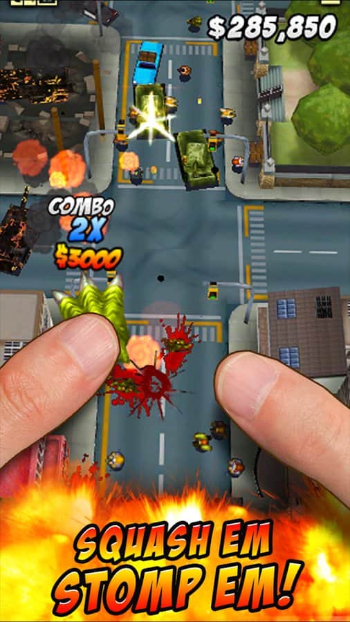ThumbZilla - весьма забавная аркада для андроид смартфонов. Здесь Вам не нужно убивать разъяренного ящера гадзилу, а напротив Вы выступаете в его роли. Крушите дома, топчите людей и машин, одним слово уничтожьте все вокруг своими мощными лапами – это и является Вашей задачей номер один. Не смотря, на то что это простенькая аркада, графика и проработка деталей получилась весьма удачно. Нажимая пальцем на экран, тем самым Вы управляете ногами ящера и от попавших под них остается лишь мокрое место или жестяная лепешка. А задействовать лапы, можно проведя пальцем по экрану!