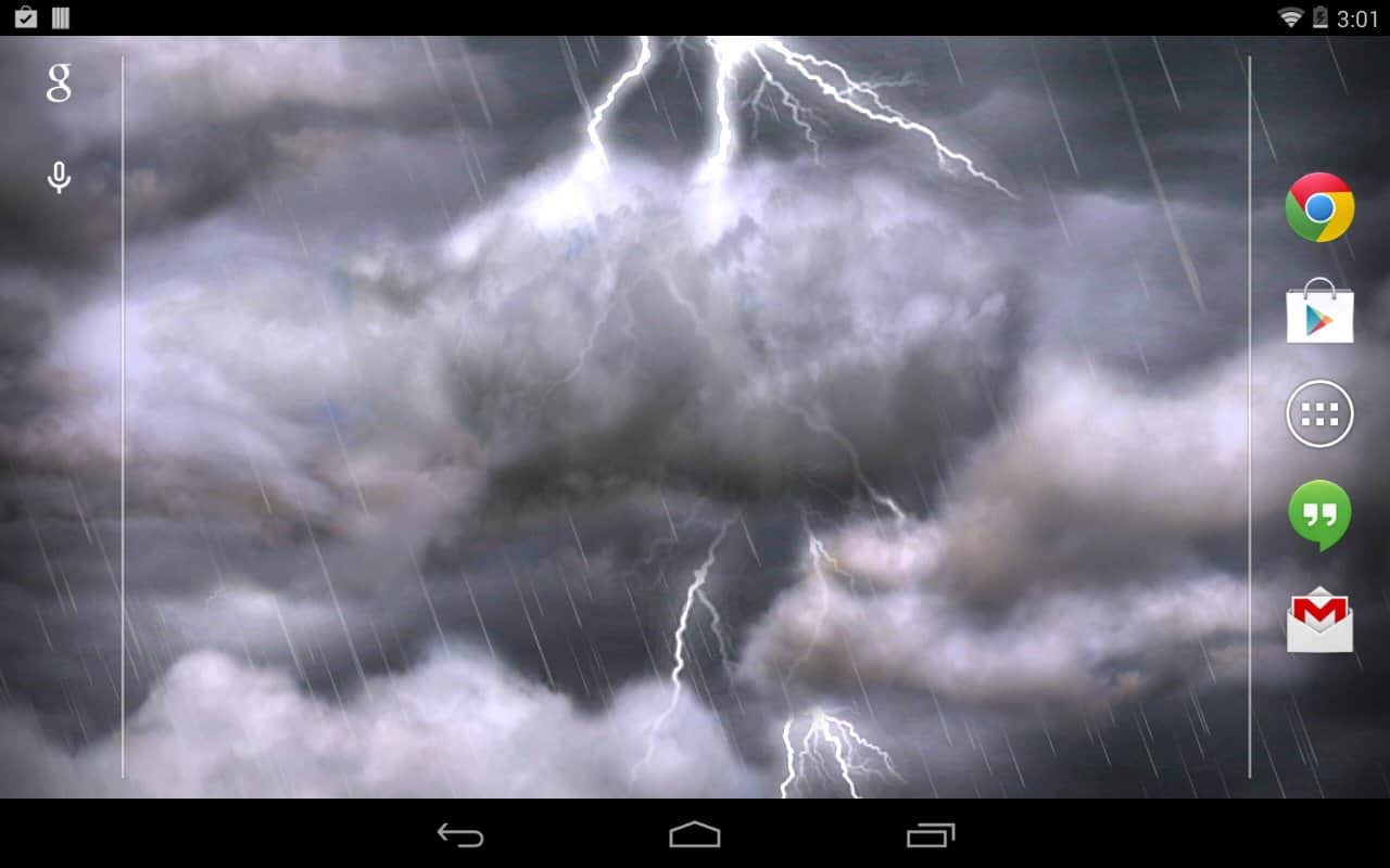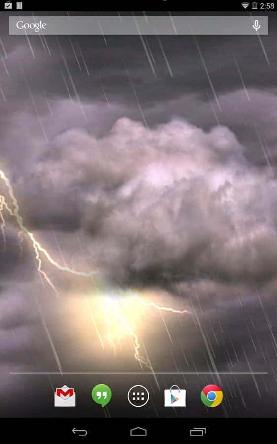Thunderstorm Live Wallpaper – громыхающие живые обои для андроид с вспыхивающими молниями и проливным дожем. Звука грома, к сожалению, пока еще нет – недоработка разработчиков. Существует 2 версии платная и на шару. Обои имеют много настроек, интерфейс на английском языке. Установите эти стихийные обои на экран Вашего смартфона и бушующая гроза будет всегда с Вами!