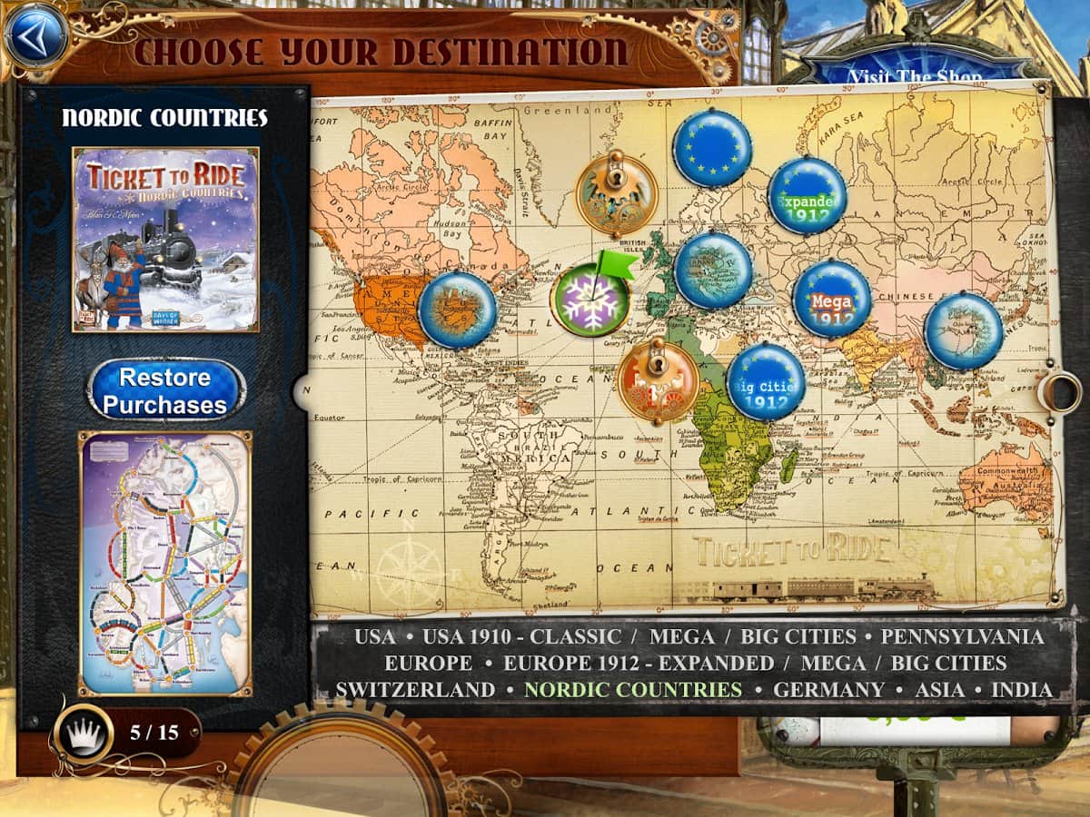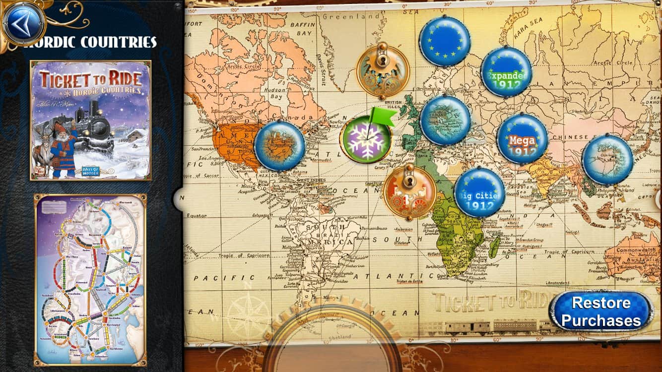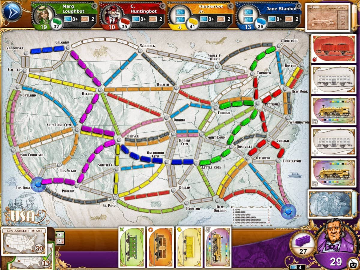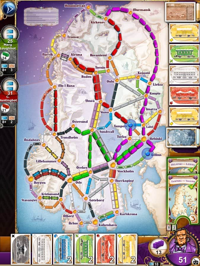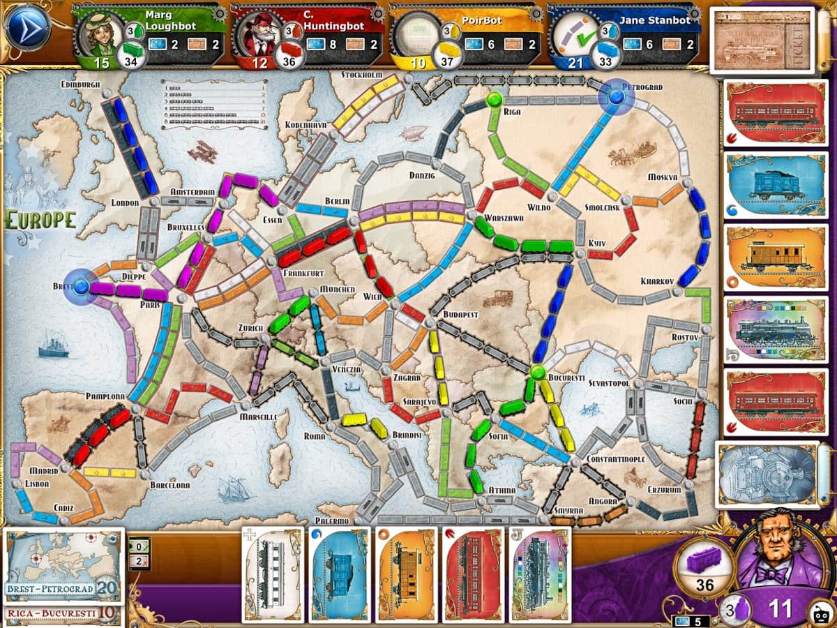 Ticket to Ride - Настольная игра на андроид с элементами стратегии. Вам предстоит окунутся в мир железнодорожных перевозок. Покупайте станции и поезда, освобождайте и осваивайте новые пути, и налаживайте перевозки. У игрока есть возможность противостоять виртуальным противникам, а также сразится со своими друзьями в режиме онлайн.