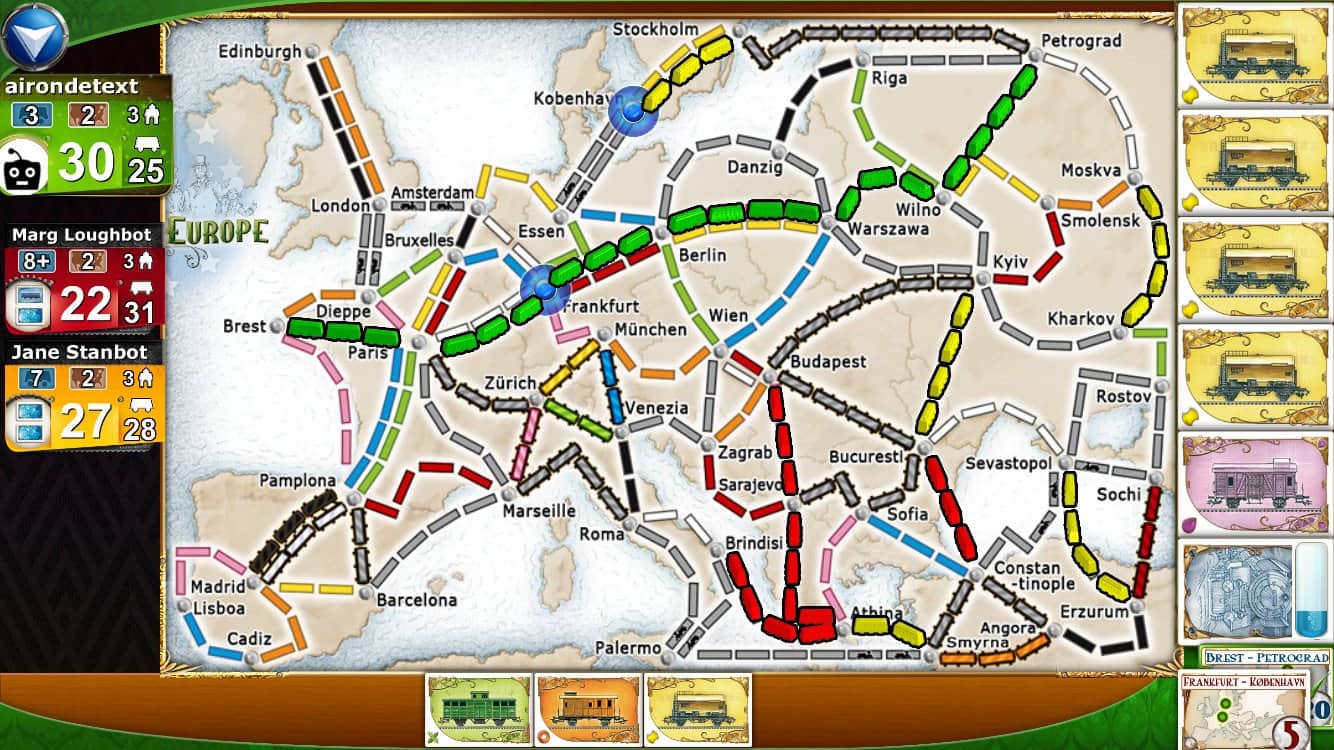 Итак, об игре. Игровым полем является стилизованная карта Европы с множеством городов. Прокладывать маршруты между городами - основная задача игрока. Какие именно маршруты - подскажут специальные карточки, которые раздаются в начале и в процессе игры. Для того, чтобы занять перегон между городами копим специальные карточки, которые соответствуют цвету перегона, и занимаем его своими игровыми вагончиками. Чем больше маршрутов вы выполните, тем больше шансов выйграть (за каждый начисляются баллы).