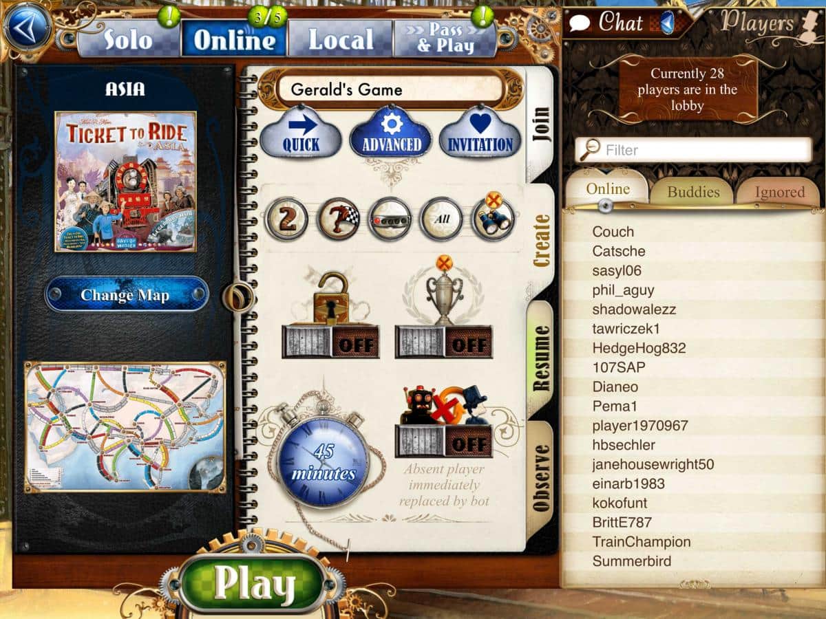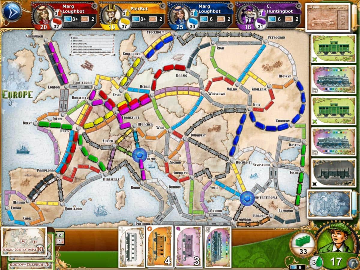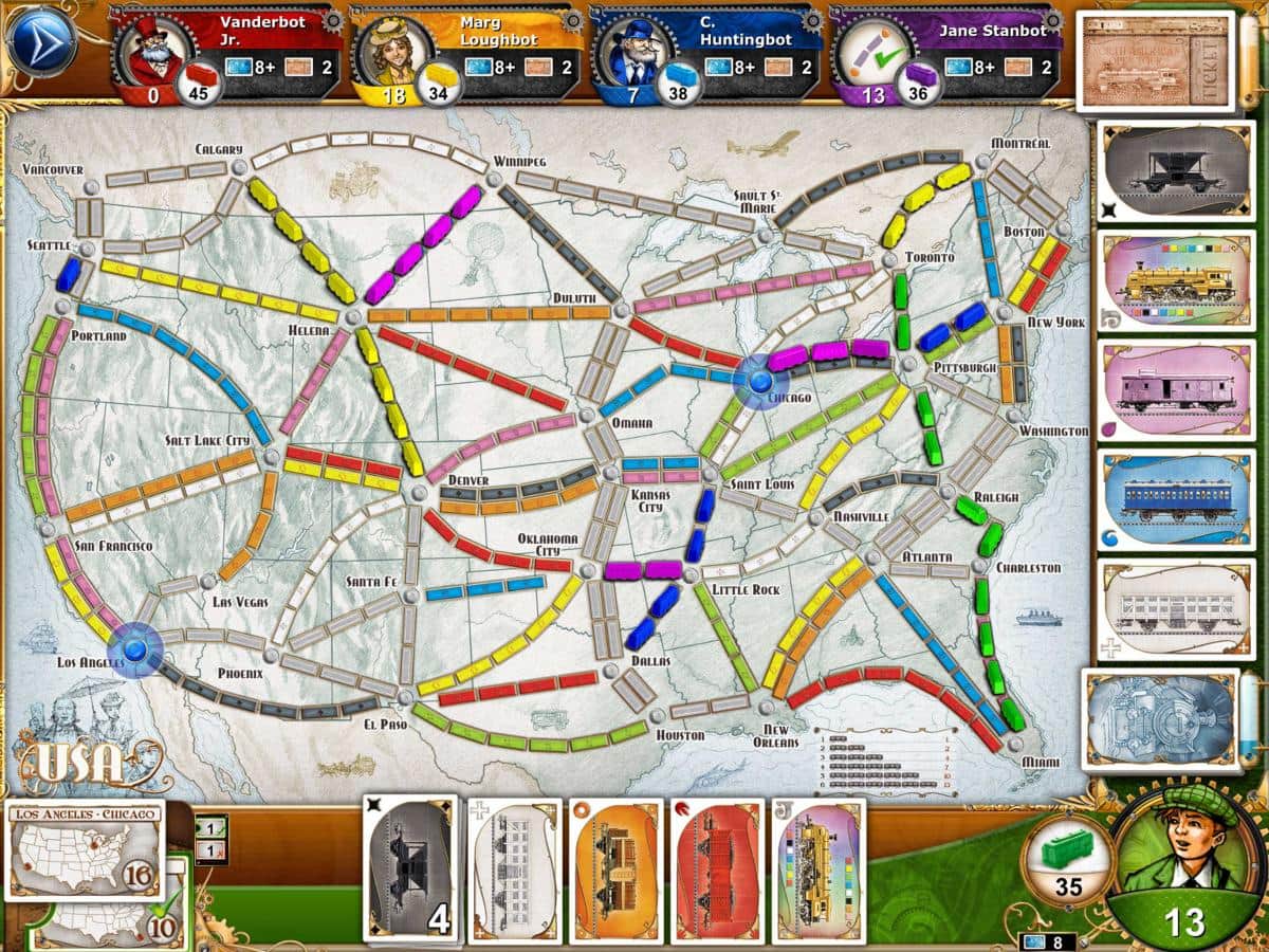 Ticket to Ride – настольная игра для IOS, где вы будете строить свою железную дорогу. В этой игре вы окунетесь в мир железнодорожных перевозок, где вам будет представлена возможность создавать новые станции, строить железную дорогу между городами и налаживать новые пути перевозок. Вытаскивайте нужные вам билеты, которые и будут определять направление вашего строительства. Соединяйте с железной дорогой только нужные города, получая за это очки. В этой игре вы сможете играть против виртуальных игроков, бросая им вызов или сразиться с другом на одном устройстве в режиме онлайн. Играйте в эту игру и соедините все города железной дорогой.