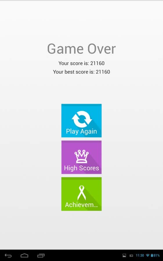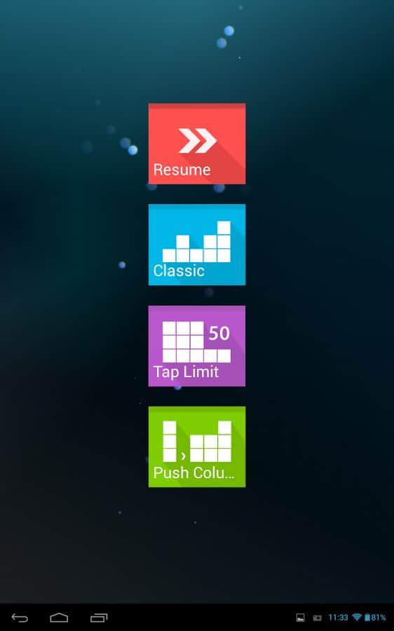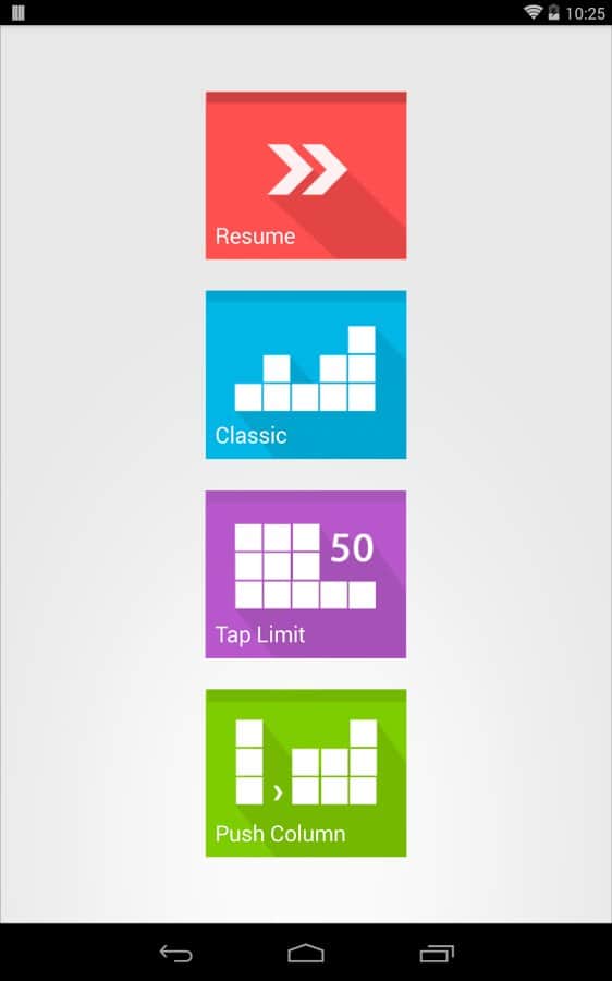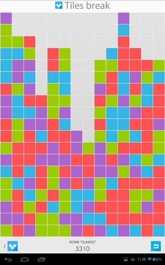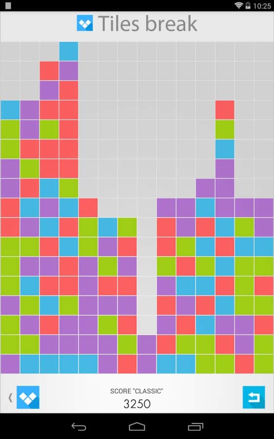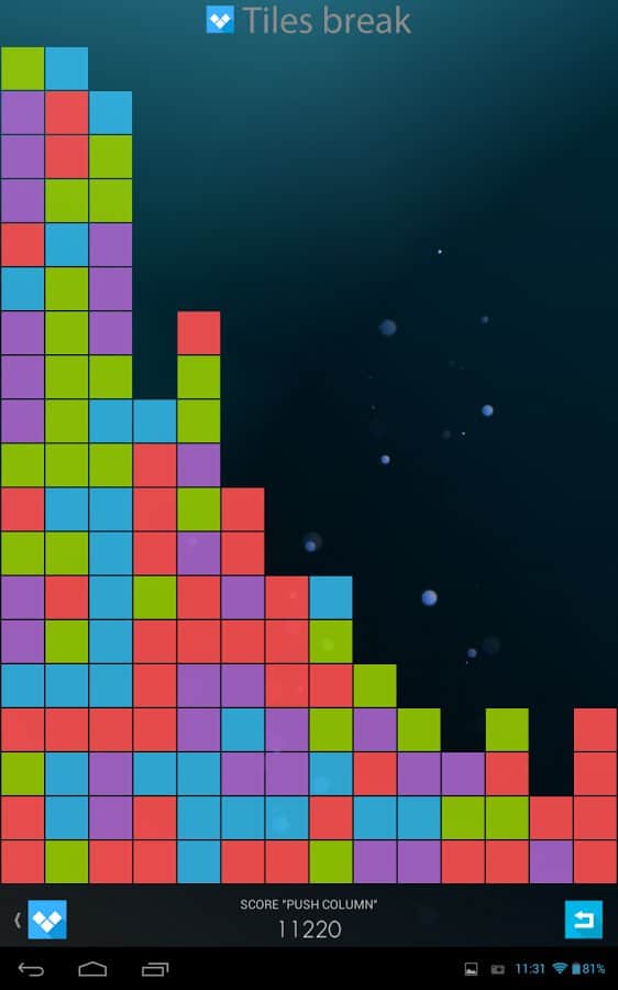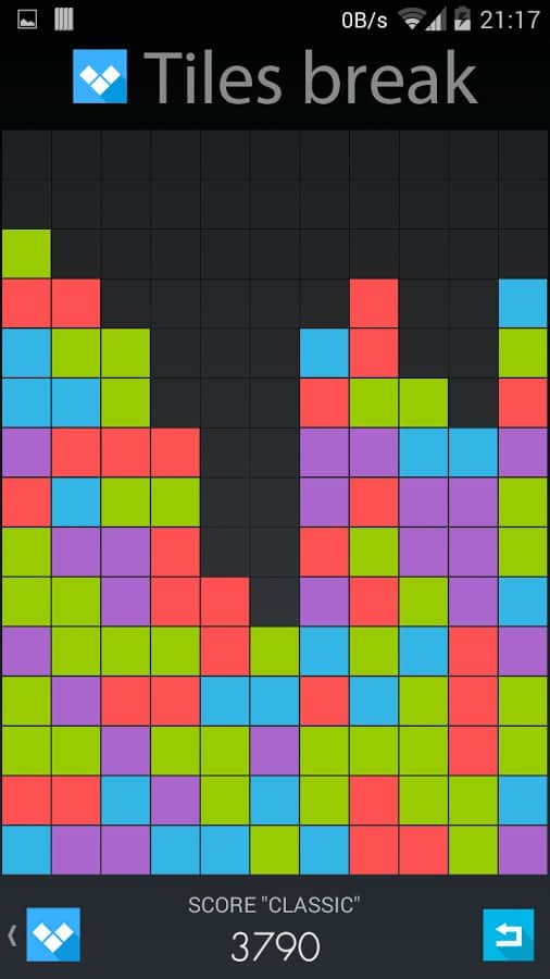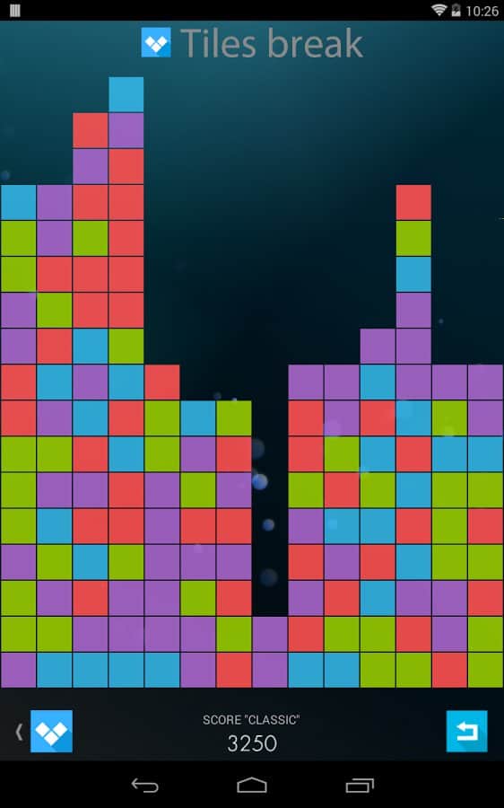 Tiles Break - Замечательный пазл-головоломка на андроид с красочной графикой и красивыми эффектами. На поле расположены плитки различных цветов, ваша задача разбивать плитки одного цвета и собирать баллы и бонусы. Но если вы сделали неправильный ход, в игре есть возможность вернуть шаги назад. Всего в игре два режима – на ограниченное количество шагов, и без.