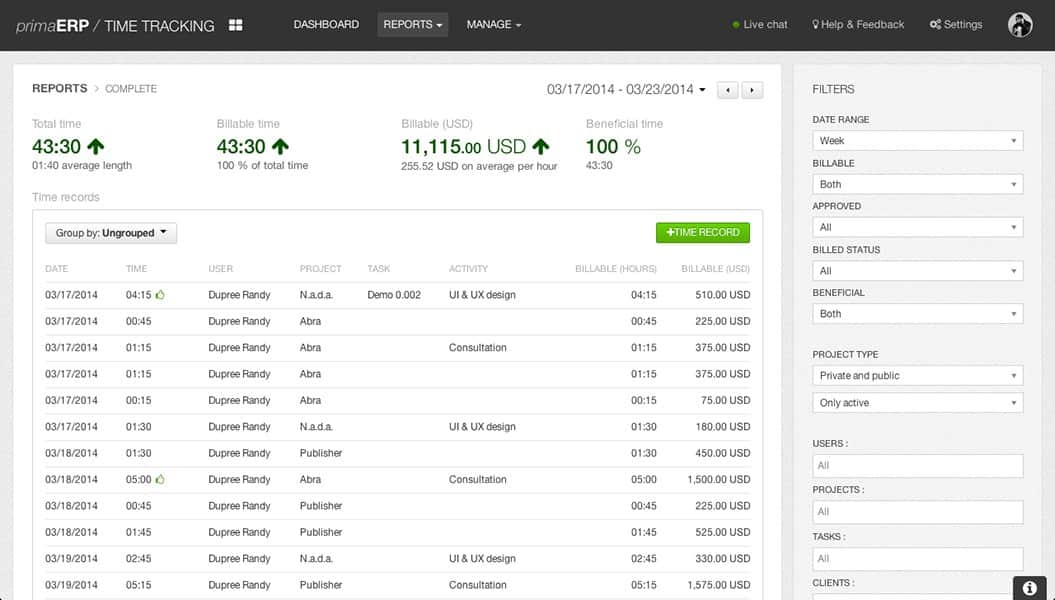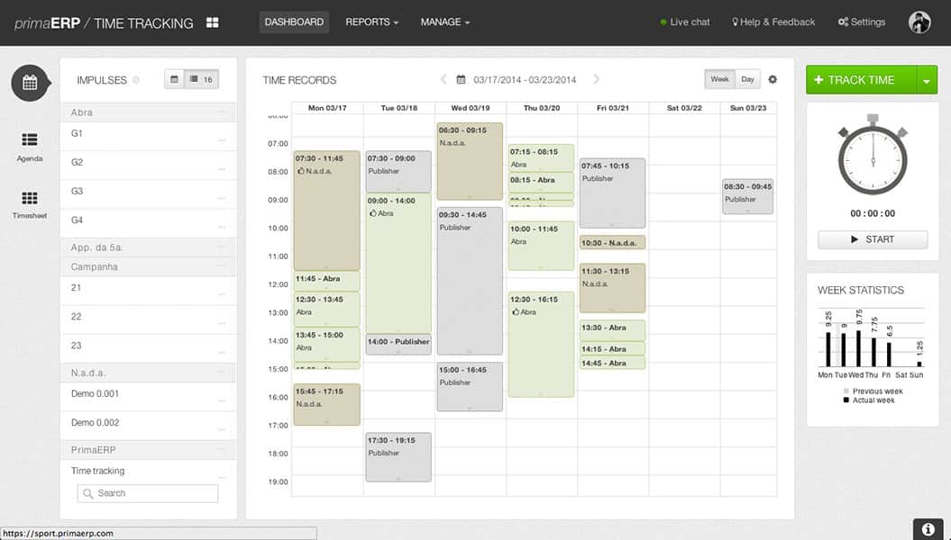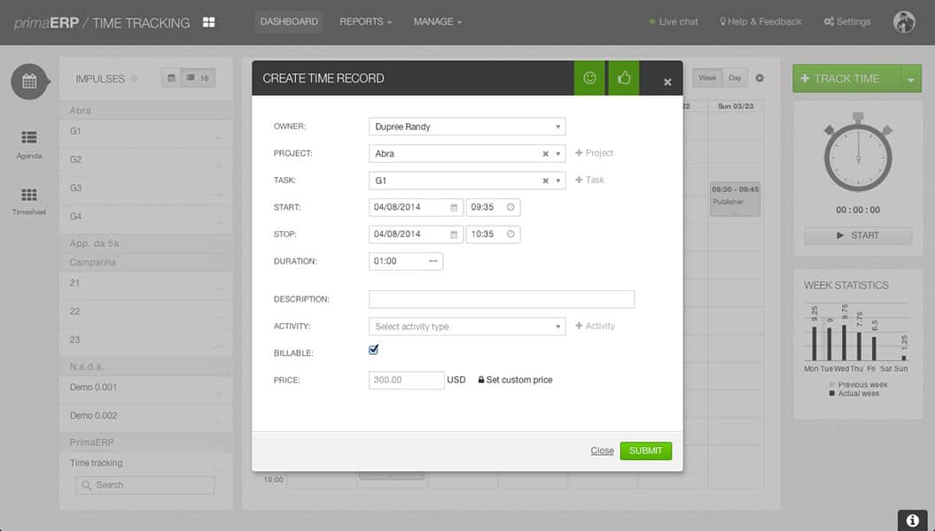 TIME TRACKING primaERP - отличный тайм-трекер, с помощью которого можно легко и просто вести учет рабочего времени. Достаточно информативное приложение, которое позволит выявить "пустые" траты времени, а также более рационально распределить это самое время по целям и задачам, проектам и клиентам. Для наглядности включена система графиков продуктивности, разных подробных отчетов с возможностью фильтрации на ваше усмотрение!