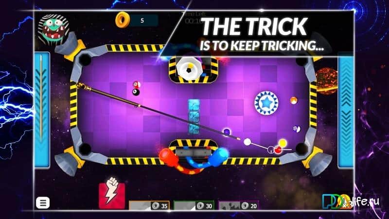 Timecues – фантастический бильярд на андроид, где вы будете путешествовать по различным галактикам. В этой игре перед вами откроются невероятные столы для бильярда с многочисленными ловушками и преградами. В игре вы не найдете классических правил игры в бильярд, а сможете открыть для себя бомбы, огненные шары, лазеры и другие финты которые помогут вам закатывать шары в лузы. Открывайте для себя новые столы, которые будут радовать вас своей формой и внешним видом. Набирайте достаточное количество очков и покупайте новые кии, которые будут обладать уникальными параметрами и преимуществами перед обычными.