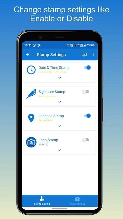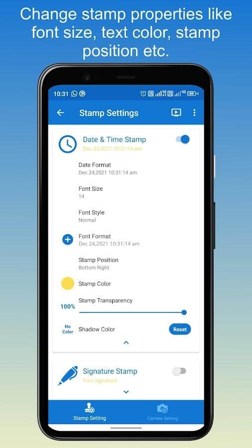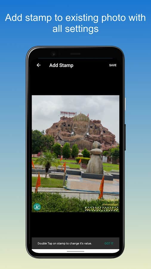 TimeStamp Camera - Включите настройку автоматической простановки адреса вашего текущего местоположения и GPS, при желании добавьте ваш логотип или штамп, разместите на снимке текст с понравившимся шрифтом, цветом и подходящим размером. Кроме того, внутри текста вы можете изменить полужирность, контур, включить курсив, подчеркивание, зачеркивание, тени любого цвета и другие функции для стилизации текста.