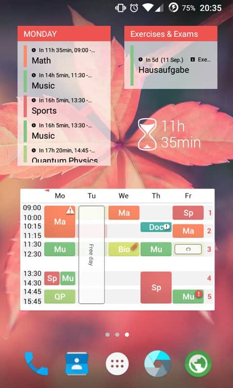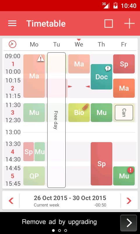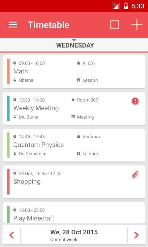 Как следует из названия, основная функция программы — создание расписания, но кроме этого в TimeTable можно отмечать свободные дни, вести обратный отсчет до следующего занятия, выключать звук на учебное время. Для каждого предмета создается карточка, куда кроме названия можно внести имя преподавателя, оценки, задания и любые полезные заметки. Просматривать расписание можно как на неделю, так и по конкретным дням, возможно создание недельных циклов.