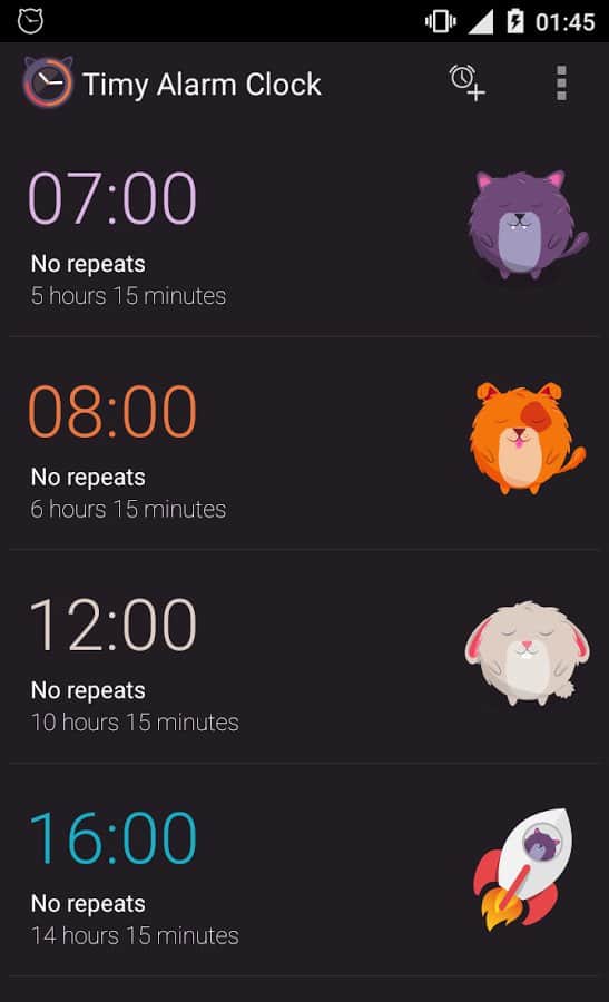 Timy Alarm Clock – порой совершенно невозможно проснуться рано утром, даже несмотря на настойчиво звонящий будильник, который вы уже переставляли не раз, даже не открывая глаз. Предлагаем вам необычный будильник, который не только позабавит вас своим интерфейсом, но и поможет проснуться окончательно, что и является его целью. Timy Alarm Clock содержит несколько персонажей таких как: собачка, кролик и кошечка, а так же три уровня сложности, которые вам необходимо пройди для окончания просыпания. Есть возможность выбора любимой композиции, для установления в качестве звукового сигнала будильника и регулятор громкости.