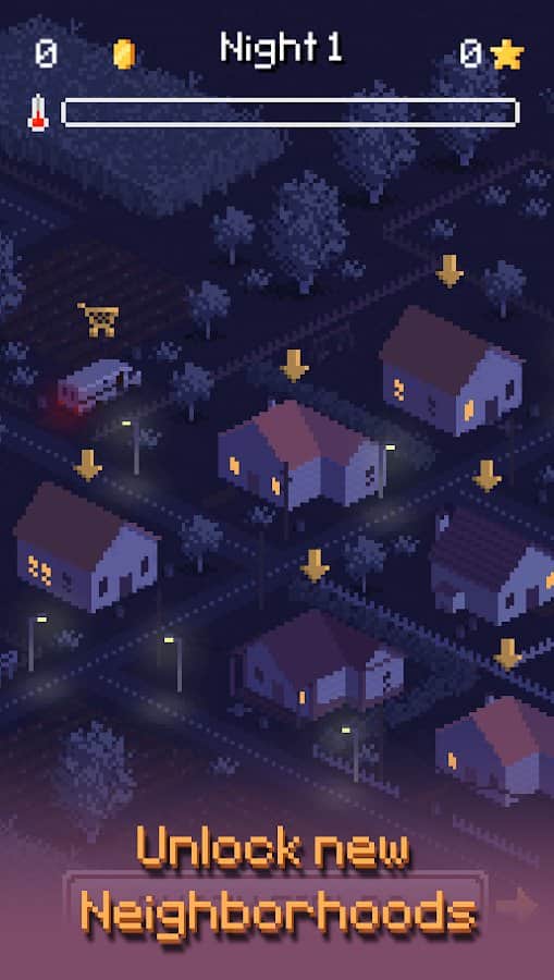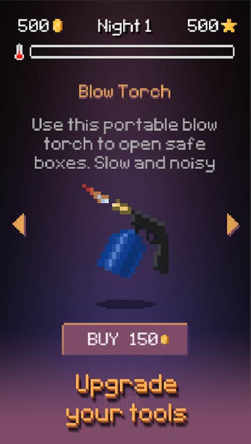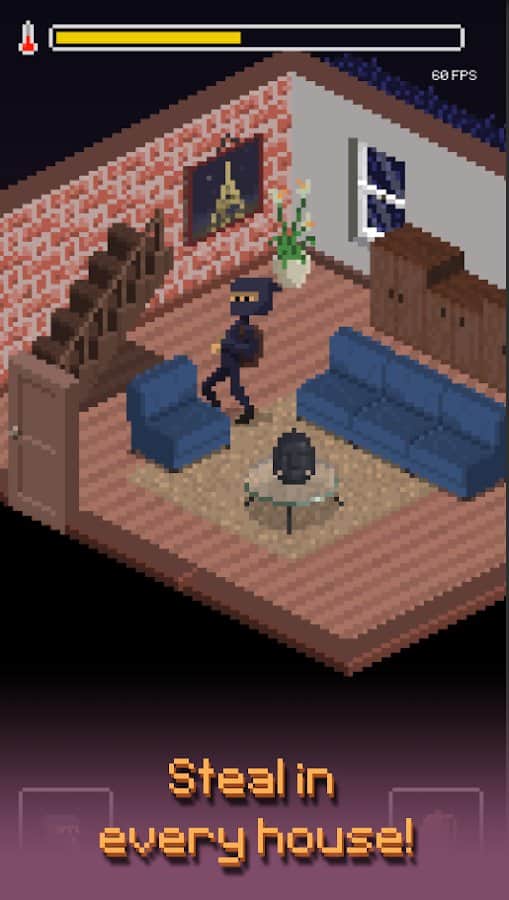 Геймплей. Собственно ты вор и твоя задача за 21 день на воровать чтобы выйти на музей и украсть рубин из музея. Для этого надо помимо накопления денег, чтобы покупать взятки полиции, рюкзаки больше, тяги побыстрее, отмычки покруче и приспособы для взлома сейфов, надо и накопить репутацию чтобы зайти в музей. Из минусов можно выделить только систему с градусником. Типо если будешь больше шуметь (собаку разбудишь, окно выбьешь, двери или сейф будешь ломать шумно) или действовать медленно, то шкала будет очень сильно накапливаться и для решения данной проблемы надо покупать взятки полиции которые с каждым разом умножаются на два или пропускать одну ночь в укромном месте. Из-за этого в версии без бесплатных покупок дойти даже до трего района будет тяжеловато, но это можно сказать плюс.