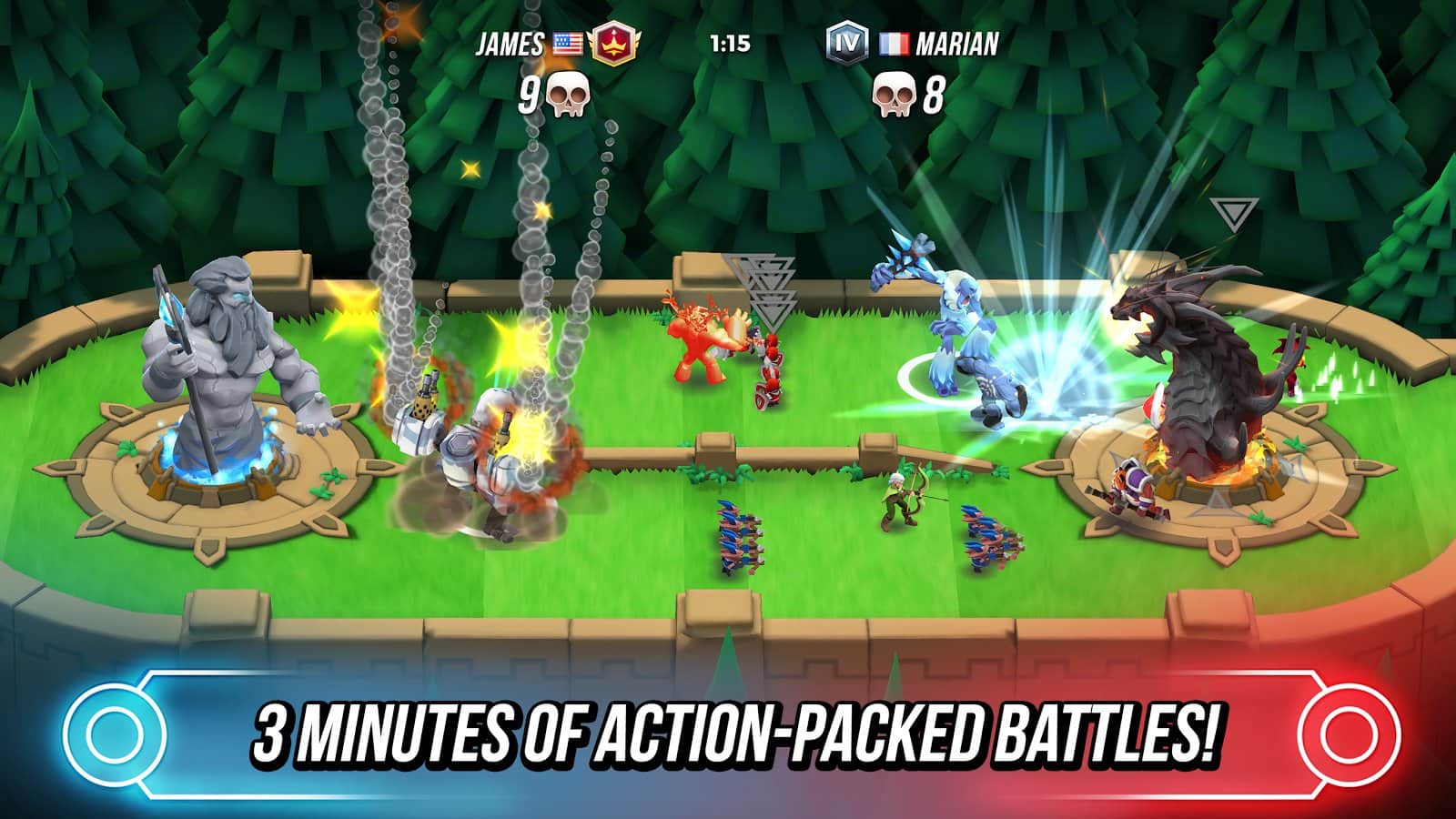 Titan Brawl: наваляй титанам – МОВА на андроид, где вы примите свое участие в динамичных боях, которые будут длиться 4минуты. Выбирайте себе героя из огромного большинства представленных в этой игре - это может быть отважный наемник, межгалактический боец или древний бог, и создайте из них непобедимую и сильную команду. Примите свое участие в массовых сражениях или PvP боях на арене. Разрабатывайте свою стратегию ведения боя и применяйте все способности каждого героя, чтобы захватить тотем врагов. Играйте со своими друзьями и помогайте им увеличивать способности своих героев по ходу игры. Коллекционируйте героев и поднимитесь на самую вершину таблицы лидеров, становясь самым удачливым игроком.