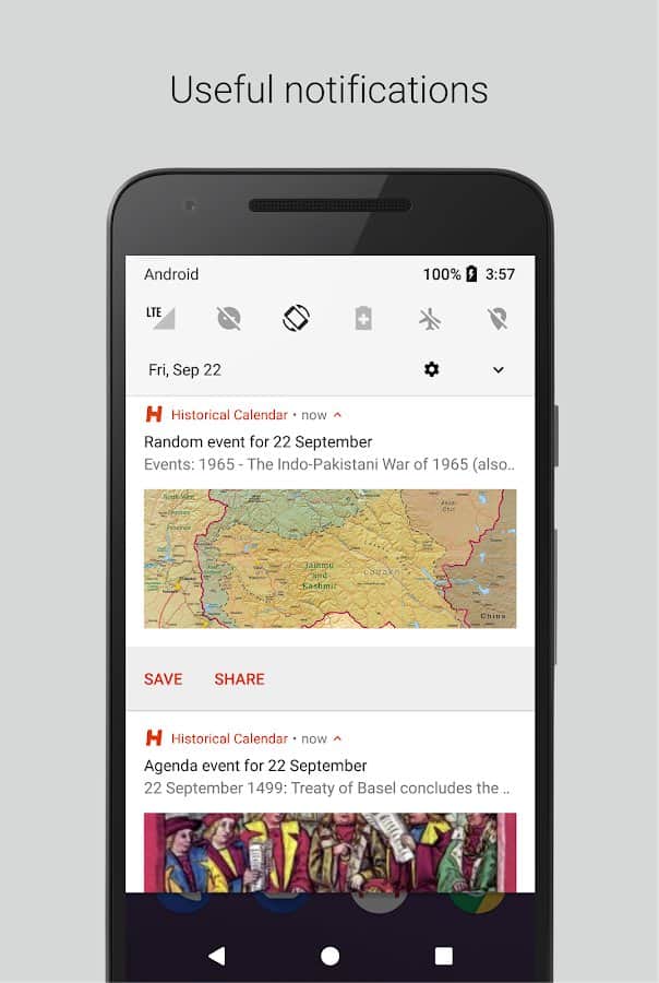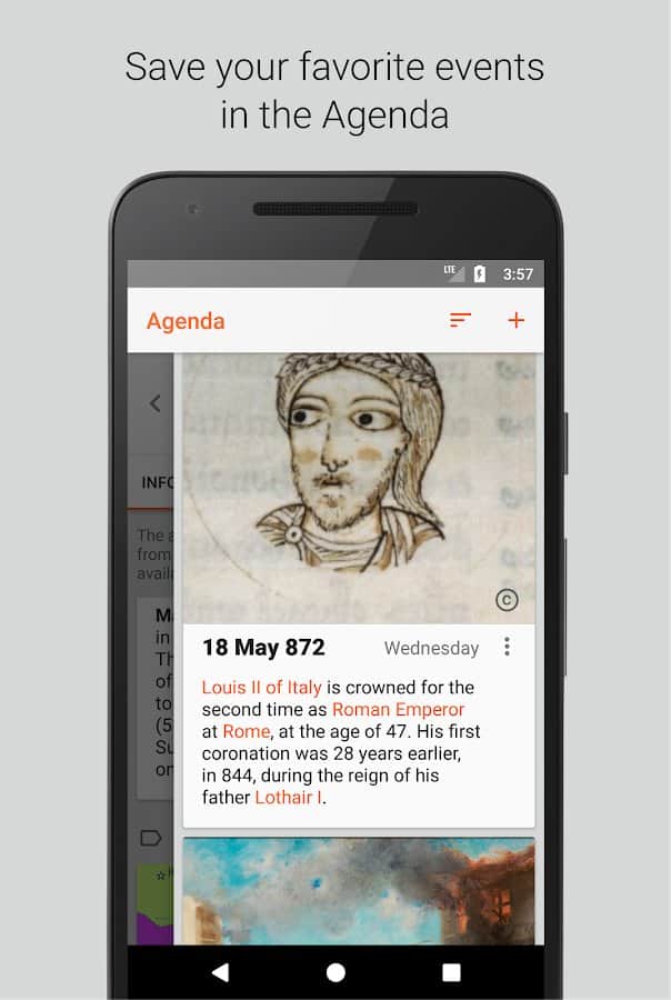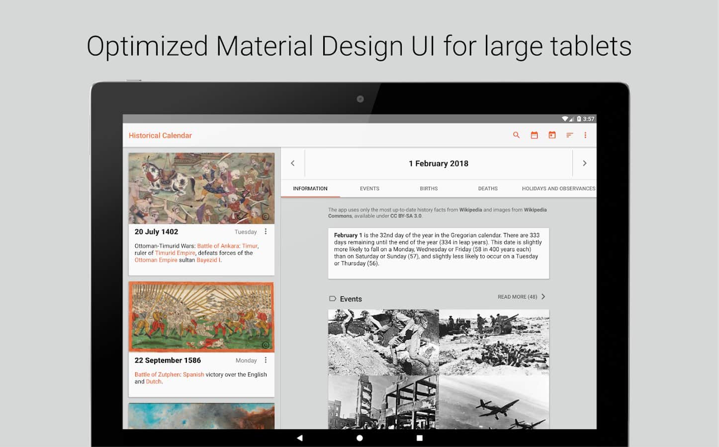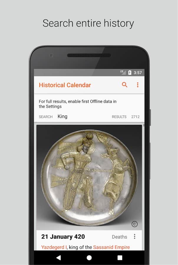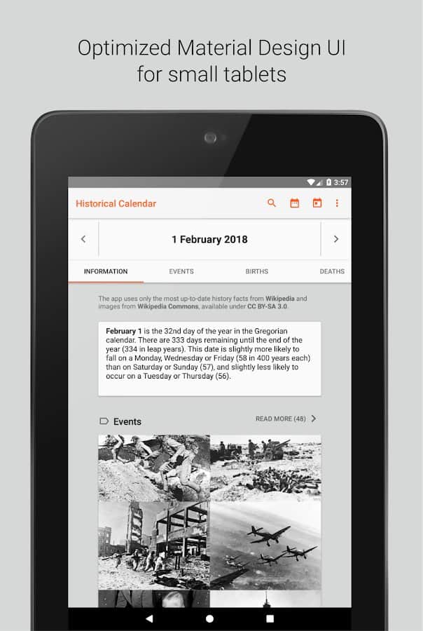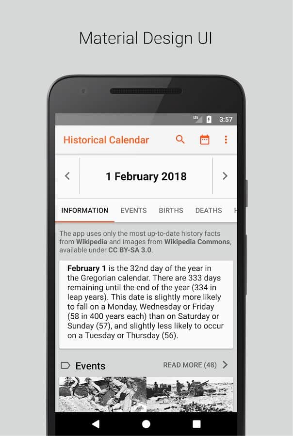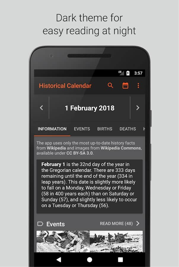 Исторический календарь наверняка заинтересует людей, которые любят пополнять багаж знаний новыми сведениями. Туда добавляется информация из Википедии, с учетом выбранного вами языка и культурной среды. Вы сможете ежедневно узнавать о праздниках, которые отмечаются в этот день, о важных исторических датах, культурных событиях и обрядах разных народов мира. Используются только новейшие факты из Википедии.
