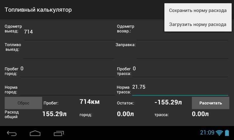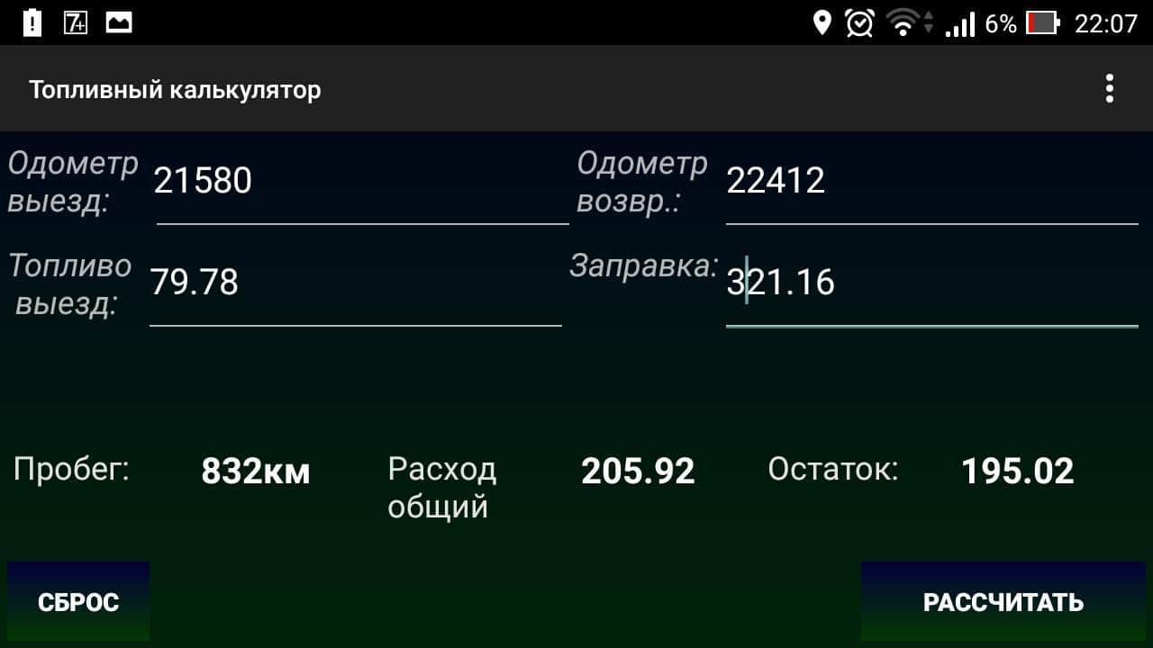 Топливный калькулятор – приложение, которое поможет рассчитать пробег и расход топлива за рейс или смену. Эти данные помогут вам легко и просто заполнить путевой лист, который обычно выдаётся на любом предприятии. Приложение поддерживает расход горючего как в городском режиме так и за городом. Если вы указали пробег только в одном случае, то второе значение будет рассчитано автоматически. Введённые в приложение нормы. Сохранятся в памяти программы, так что если вы её выключите а, через определённое время включите обратно, все данные буду всё равно сохранены.