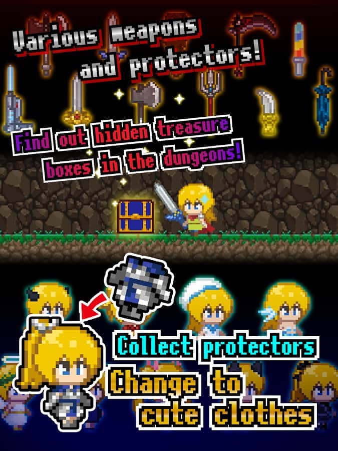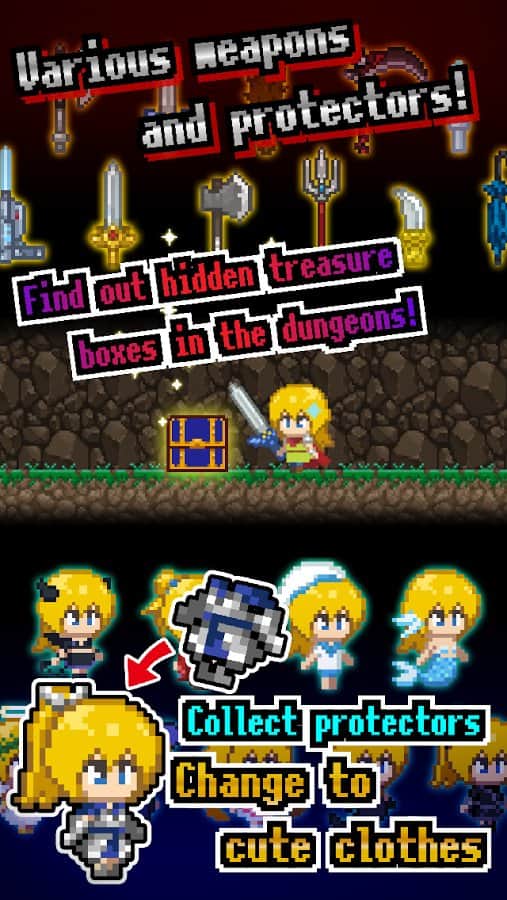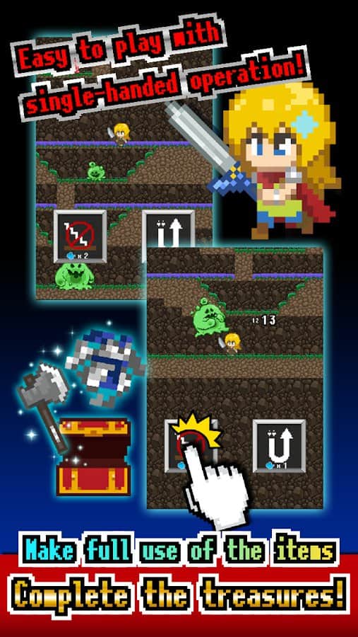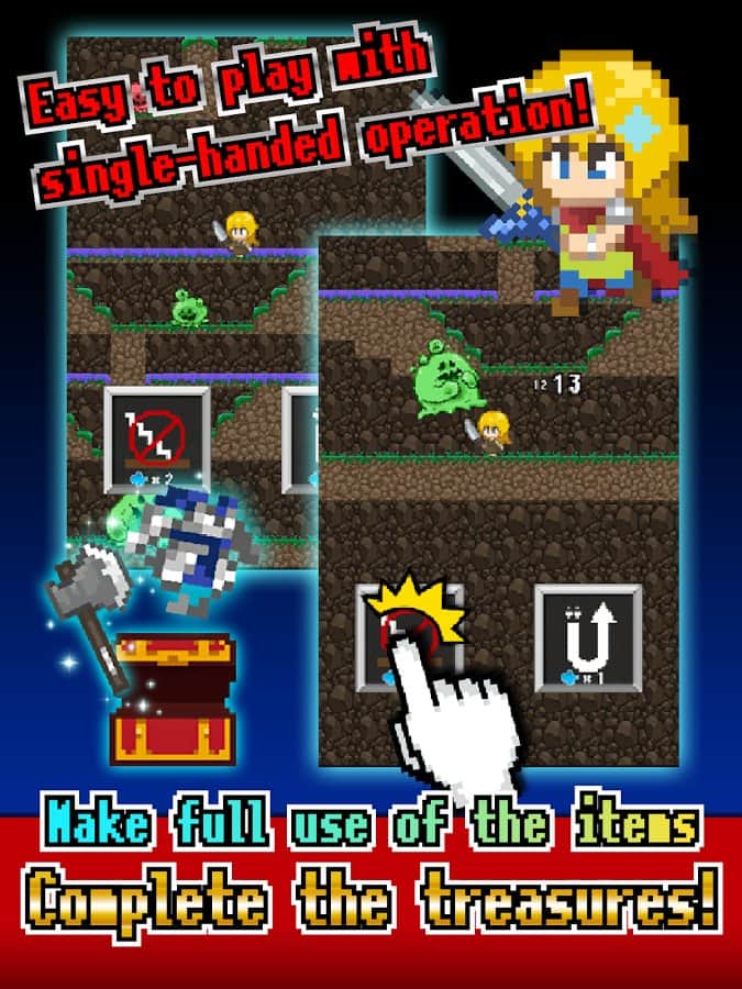 Tottoko Dungeon - RPG с элементами квеста на андроид, где вам предстоит спуститься в опасное подземелье для исследования его. Игра сделана в классической пиксельной графике с легким управлением, где вы будете управлять главным героем с помощью одного нажатия. Исследуйте огромное подземелье и ищите там новое оружие, защитные и специальные навыки. Проходите захватывающие квесты и сражайтесь с мощными боссами, которые поджидают вас на каждом шагу. Пройдите все подземелье и найдите в нем все спрятанные для вас предметы. По мере прохождения игры ваш герой будет наделяться разными способностями и облачаться в разные наряды.