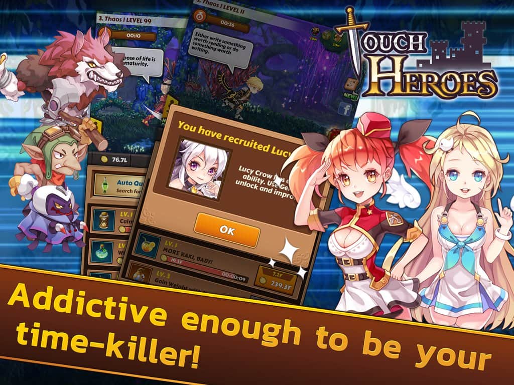 Touch Heroes: Soul Crash – приключенческая кликер игра, в которую можно играть долгое время. Легендарный мастер меча Люси Кроу только что получила задание спасти мир, и в настоящее время вместе о своими друзьями я отправляется мстить. Кликайте и наблюдайте как ваши герои ошеломительно наносят атаки на своих врагов. Больше кликов больше побед! Зарабатывайте больше золотых монет и вы сможете быстрее проходить уровни. Наймите героев и разблокируйте специальные способности, модернизируйте оружие для лучших атак завоевать замки, заранее через полы, чтобы доказать свою силу. Каждые 30 уровней вы будете получать подарочные коробки.