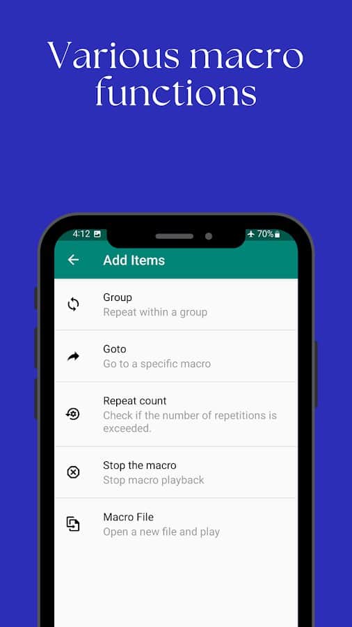 TOUCH MACRO - отличное приложение с которым ты сможешь автоматизировать повторяющиеся прикосновения по экрану своего девайса. Это приложение, которое предоставляет различные функции, такие как групповой повтор, сравнение изображений и элементы GOTO. Приложение может выполнять сложные задачи, быстро повторять нажатия, находить изображения на экране и нажимать на них.