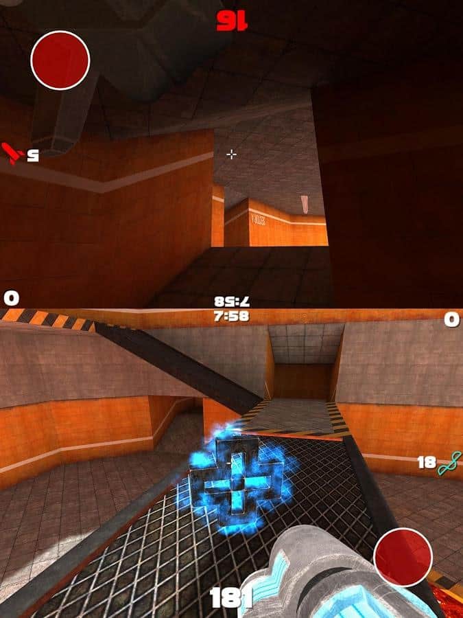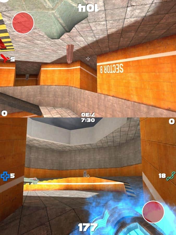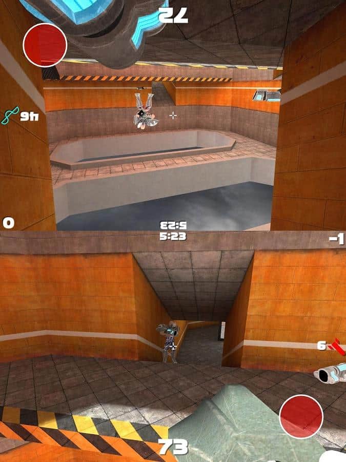 Tourney – стрелялка на андроид, действия которой происходят от первого лица. Эта игра создана для двух игроков, которые смогут играть одновременно каждый на своем поле в режиме сплитскрин. Берите в руки оружие и бросайте вызов своим друзьям, сражаясь с многочисленными врагами и исследуя различные помещения военной базы. Перемещайтесь по базе и уничтожайте врагов, собирая после боя их оружие. Добивайтесь наилучших результатов в этой игре и докажите на деле что вы лучший стрелок. Не позволяйте друзьям обойти вас, набирая больше очков и оружия чем у соперника. Приятной игры.