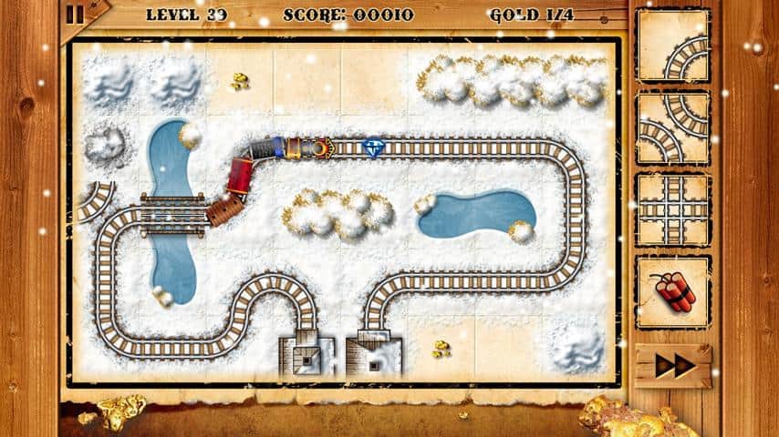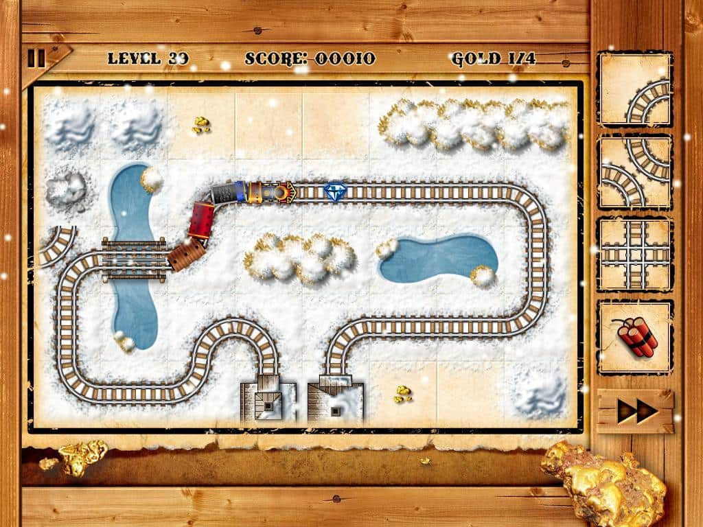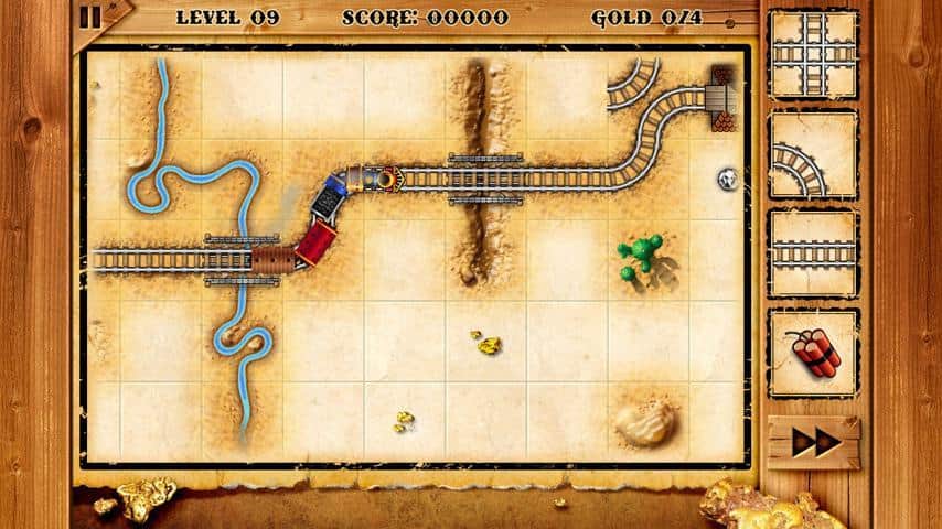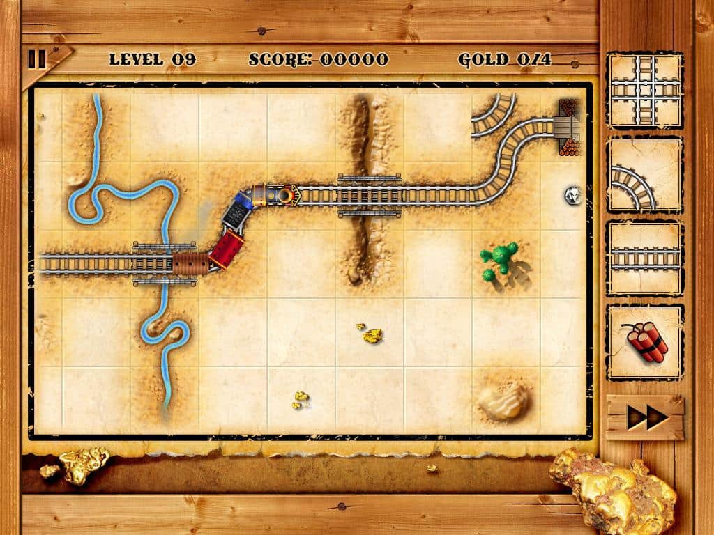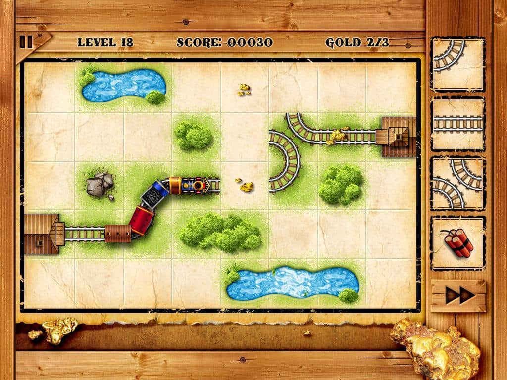 Train of Gold Rush - В этой игре на андроид ваша задача построить железную дорогу на протяжении 125 удивительных уровнях, в трех разных мирах. Это не так легко, как кажется на первый взгляд, ведь варианты рельс вам подставляет игра случайно, а время уходит с очень большой скоростью. Установите цепочку из рельс чтобы собрать все золото на и перейти на следующий уровень.
