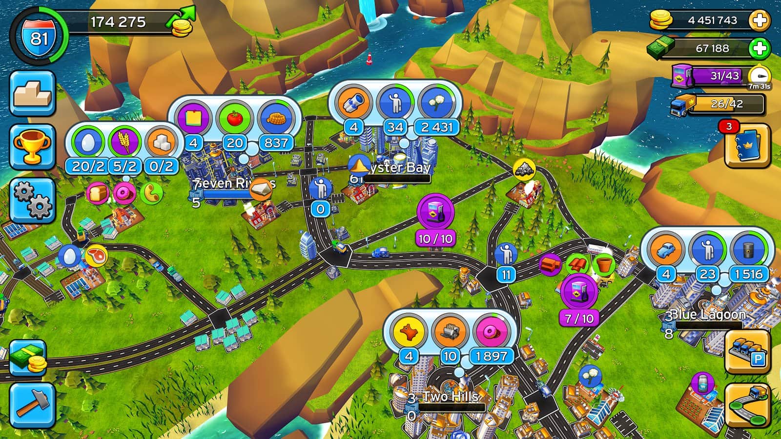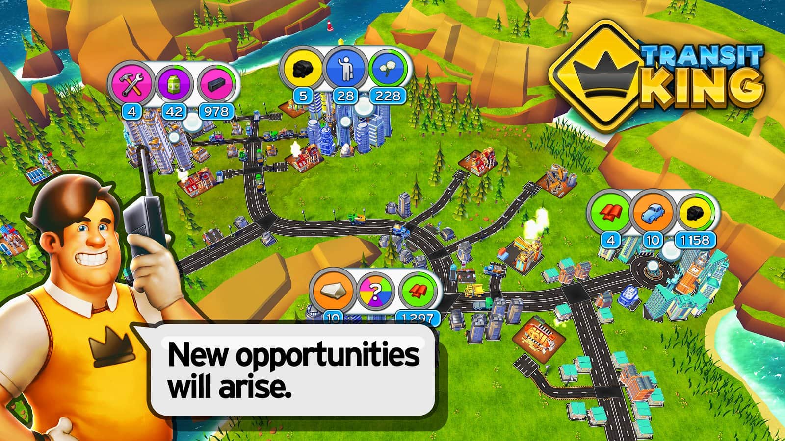Transit King – увлекательная стратегия на андроид, где вы будете управлять огромным островом. В этой игре вашей главной задачей будет развивать и улучшать свой остров, создавая огромные города и соединяя их между собой дорогами. Выполняйте все миссии и задания игры и добейтесь того чтобы ваш остров процветал и заработайте как можно больше денег. Прокладывайте автомобильные и железные дороги и соединяйте города, села, фабрики и фермы. Добывайте полезные ископаемые и на заработанные деньги стройте новые дороги. Управляйте движением транспорта и развивайте свой город строя огромные мегаполисы.
