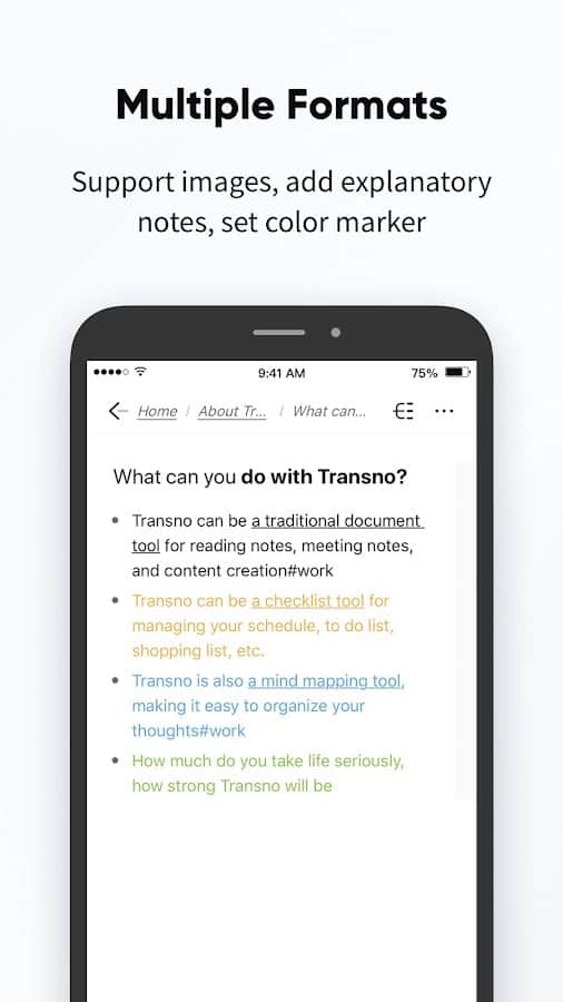 При помощи Transno вы никогда не забудете посетить важную встречу или купить нужный товар в магазине, заплатить кредит или забрать ребенка из детского сада. Управлять своими записями и примечаниями стало еще удобнее и проще. Создавайте заметку на ходу в одно нажатие на экран, делайте пометки тегами, чтобы собрать все записи в одной программе и быстро их находить. Приложение дает возможность создавать огромное количество вложенных списков, перетаскивать данные из одной папки в другую, добавлять пометки, увеличивать масштаб документа, вставлять изображения и другие файлы, помечать заметки в качестве выполненных, изменять цвета и шрифт по своему усмотрению.