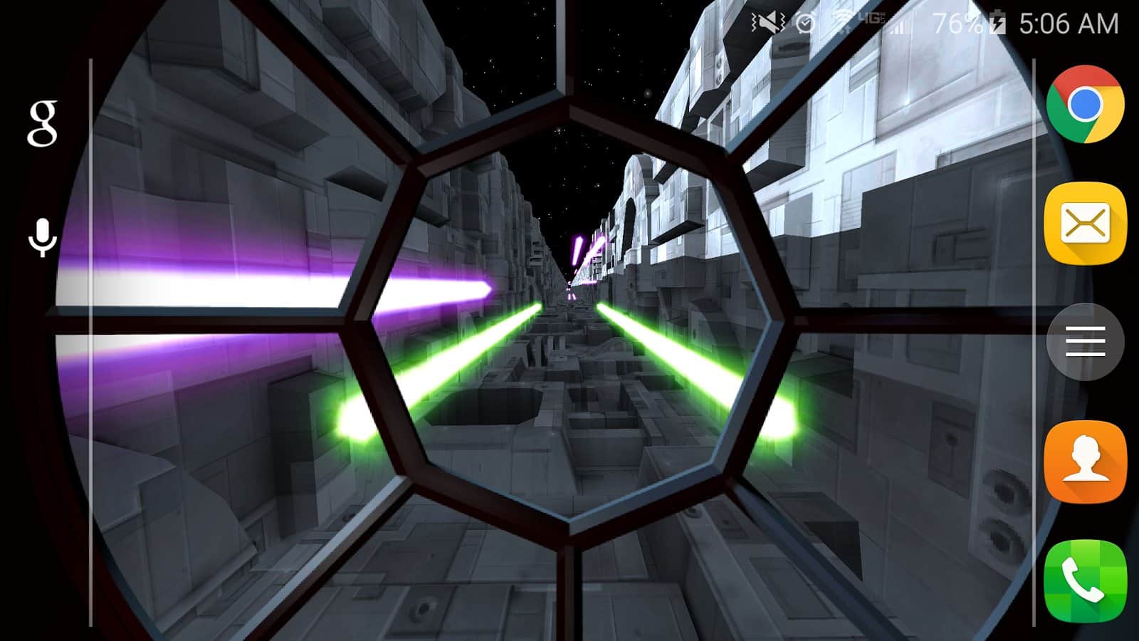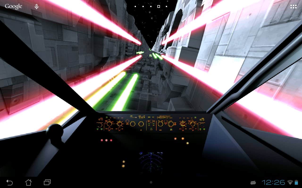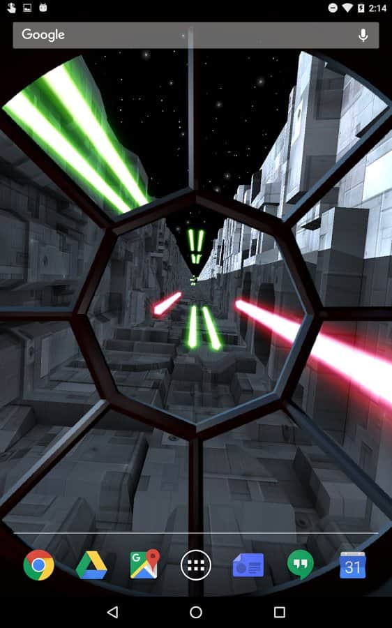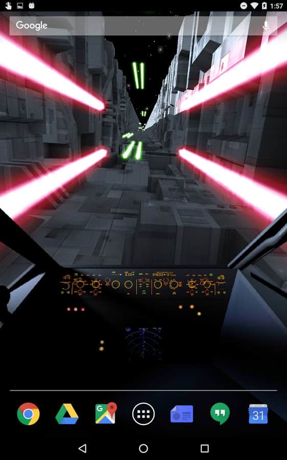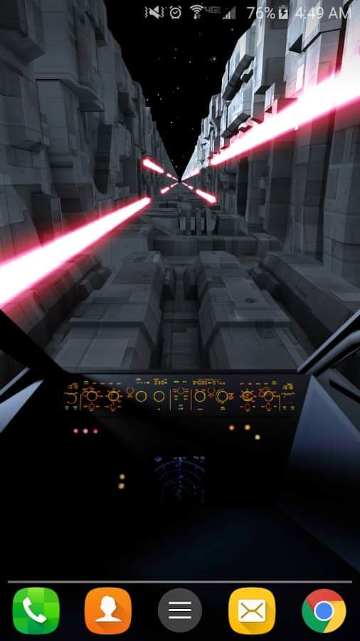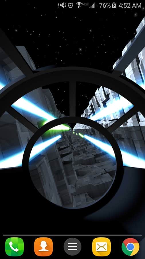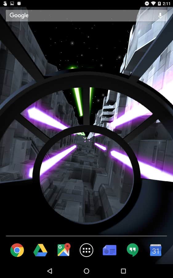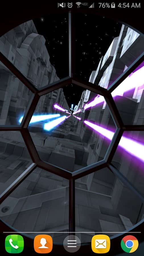 Trench Run Live Wallpaper – если вы любите «Звездные войны» то эти живые обои просто созданы для вас. Возьмите под свой контроль кабину пилота и перемещайтесь по узким ущельям свой корабль, пытаясь уйти от преследования врагов. С помощью акселерометра перемещайте кабину пилота самостоятельно или установите автопилот. Эти обои порадуют вас неповторяющимися ущельями, которые будут генерироваться случайным образом, а также возможностью выбрать скорость перемещения корабля. Нажимайте на экран своего телефона или планшета, чтобы стрелять лазером по врагам и уничтожать препятствия. Выбирайте самостоятельно цвет лазера и узор стрельбы.