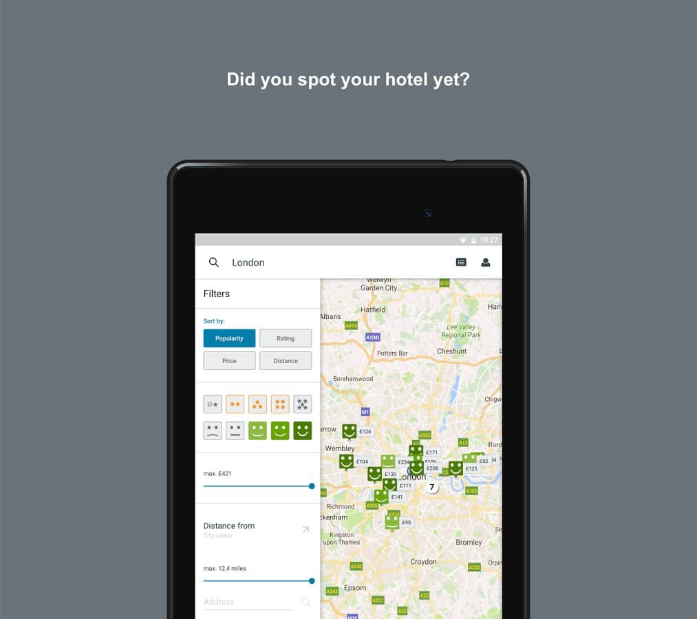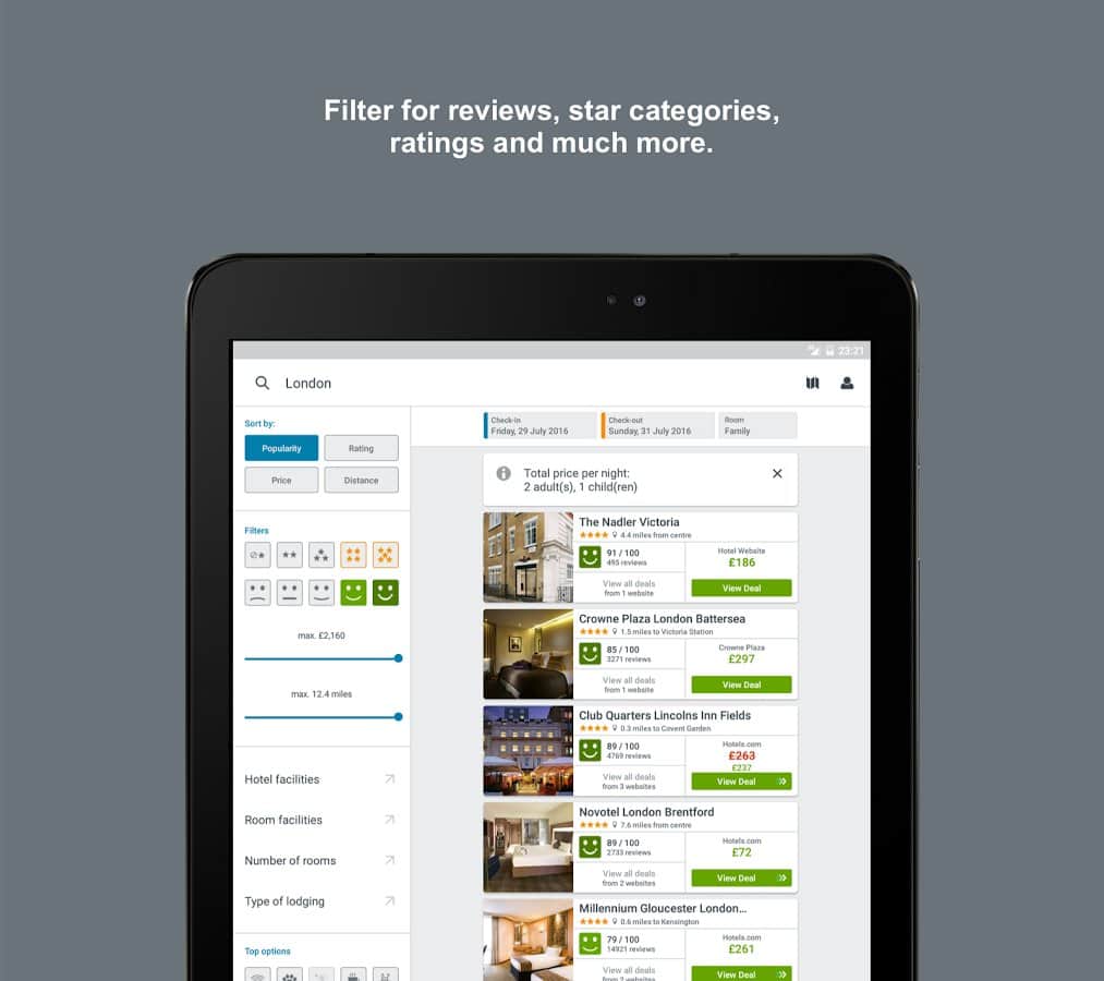 - удобный поиск отеля или гостиницы, фильтр по местоположению и ценам;