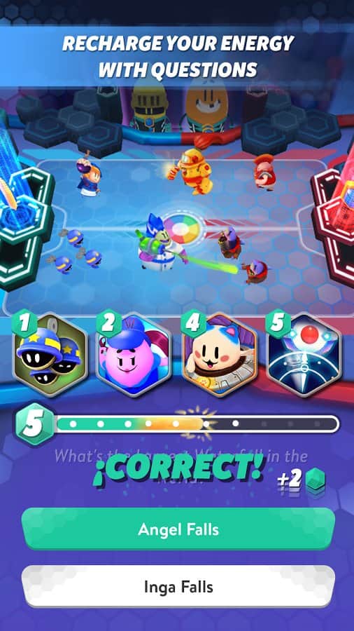 Trivia Crack Heroes – стратегия на андроид, где вы будете сражаться с сильными противниками на арене и отвечать на вопросы. Вашей главной задачей в этой игре будет собрать свою непобедимую команду и отправить ее на поле для сражений для того чтобы уничтожить энергетический щит противника и получить медаль. Покажите на деле свои стратегические и умственные таланты, правильно отвечая на поставленные вопросы и получая нужную вам энергию, которая пригодится в битве. Уничтожайте врагов, применяя уникальные особенности своих воинов. Бросайте вызов реальным игрокам со всего мира и сражайтесь с ними на арене.