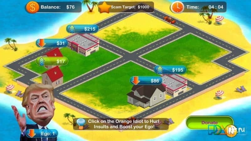 Trump Tycoon - казуальная аркада в которой вам предстоит выступить в роли Трампа и как раз таки заняться скупкой дешевой недвижимости, а затем ее продажи по более высоким ценам. Сам по себе игровой процесс прост и незамысловат, но именно в этом и состоит его прелесть. Подобный подход позволяет создать увлекательную и затягивающую аркаду в которую способен выиграть каждый. Что в свою очередь создает максимальное количество игроков. Данный проект поможет вам скоротать массу свободного времени.