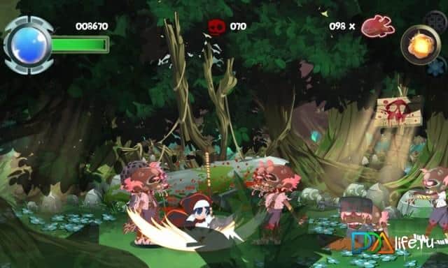 Twin Blades: The Reaping Vanguard - это впечатляющий экшен-зомби-слешер с видом от третьего лица для Bada. Главная героиня – монахиня по имени Анжелика, от которой никто не ожидал того, что она схватит верную косу и начнет рубить зомби. Причем не без помощи своего наставника – Святого Рикардо, который продает различное оружие зомби-уничтожения. Чтобы воспользоваться им, надо, в свою очередь, заполнить шкалу энергии до определенной отметки, убивая злых зомби. Из умерщвлённых покойников выпадают сердца, которые можно (и нужно) обменивать на новые умения или оружие.