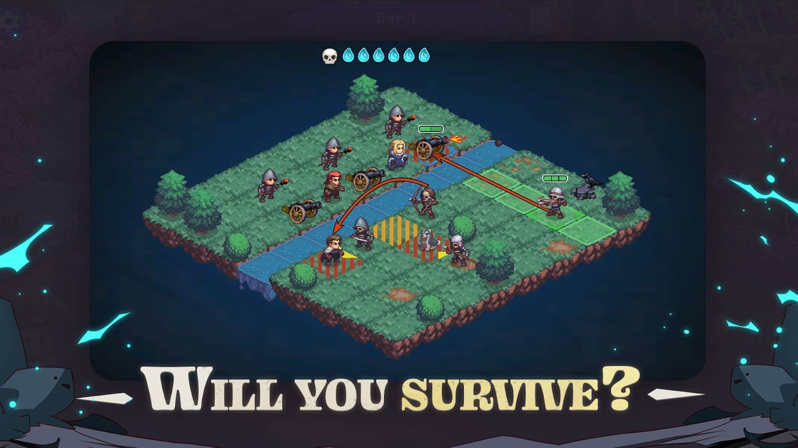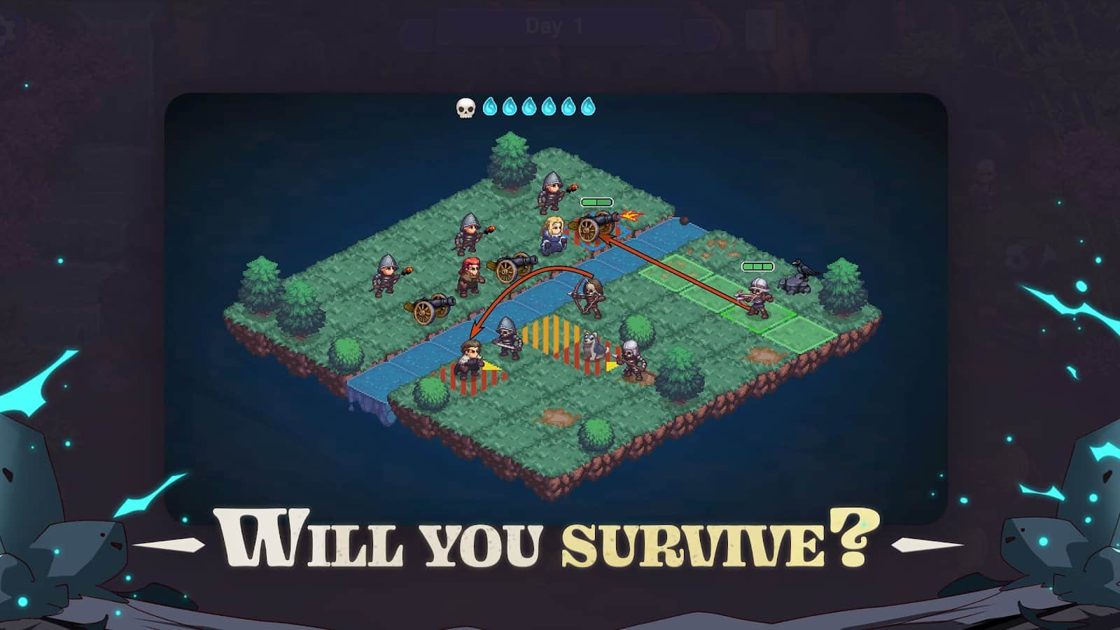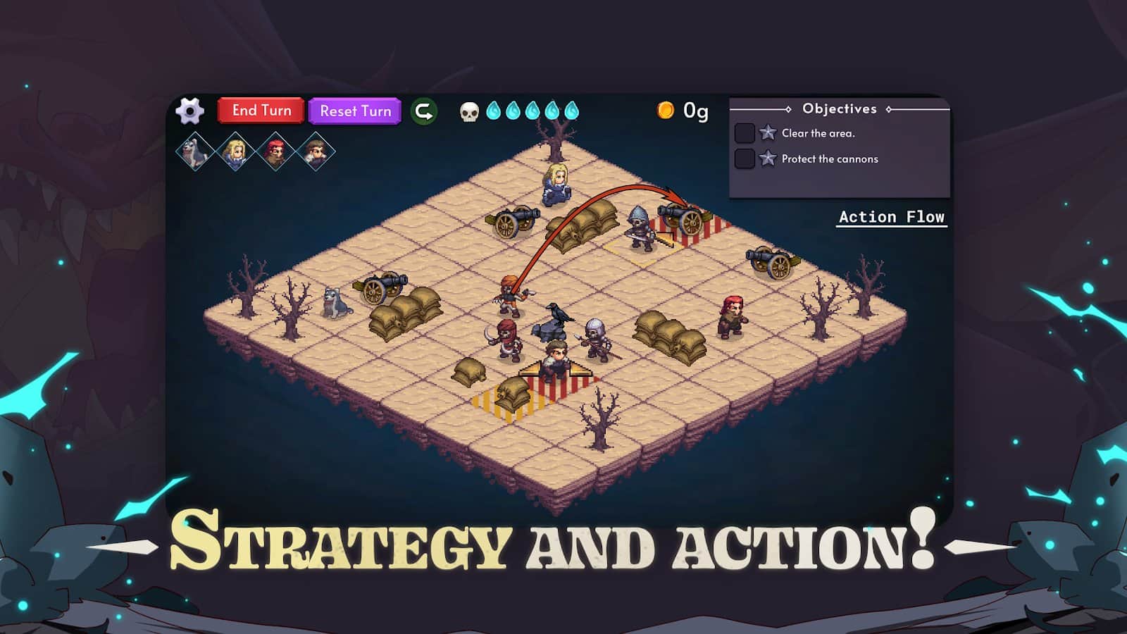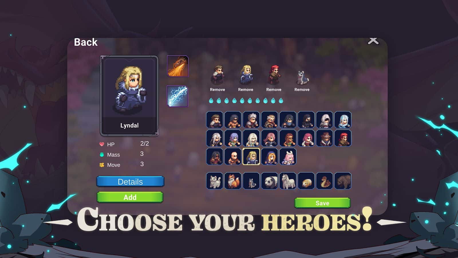 Давольно интересный клон Into the Breach. Нам тут дают постоянно расширяющийся лагерь в котором обитают герои и их питомцы. Базово нам на выбор дают 4 героя разных классов и 2 питомцев, при этом один из героев занимает роль лидера (а это влияет на то, какие бонусы получает отряд). Для открытия новых бойцов надо выполнять ачивки.