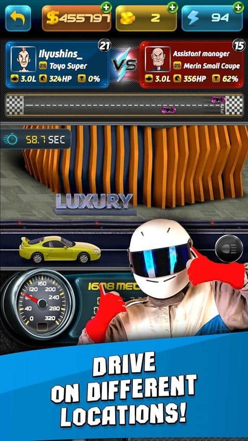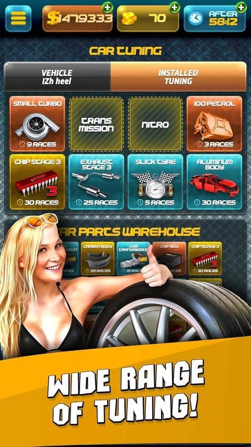Уличные Гонки, симулятор стритрейсера! – гонки на андроид, где вы сможете на деле проверить свои навык отличного гонщика. Начните свой карьерный рост, гоняя на отечественных машинах по городу и добейтесь невероятных результатов. Помимо ваших гоночных умений вам также предстоит научиться правильно тюнинговать свой автомобиль, добавляя нужные детали и торговаться с продавцами машин. Приобретайте свой автомобиль по выгодной цене и улучшайте его в своем гараже, добавляя турбины, спорт кпп, делая чип тюнинг и ставя новую резину. Бросайте вызов сильнейшим игрокам со всего мира и гоняйте с ними по трассам города или через лес. Игра порадует игроков многочисленными и разнообразными машинами начиная от ВАЗ 2101 до спортивных суперкаров. Добейтесь невероятных результатов в этой игре и докажите всем что вы лучший гонщик.