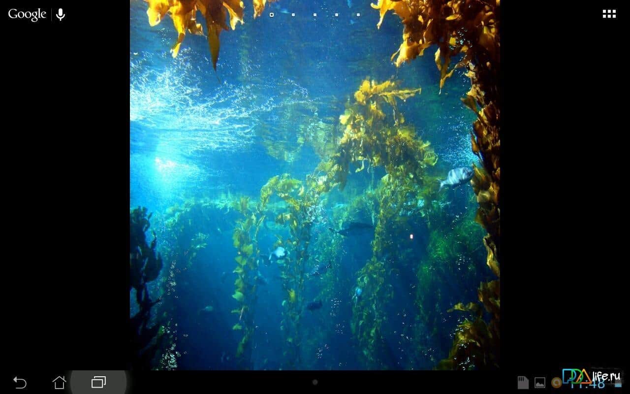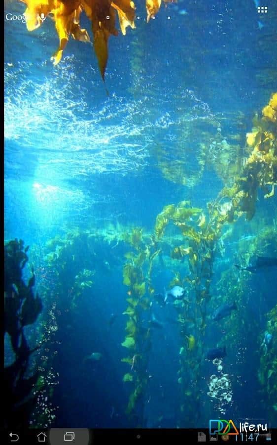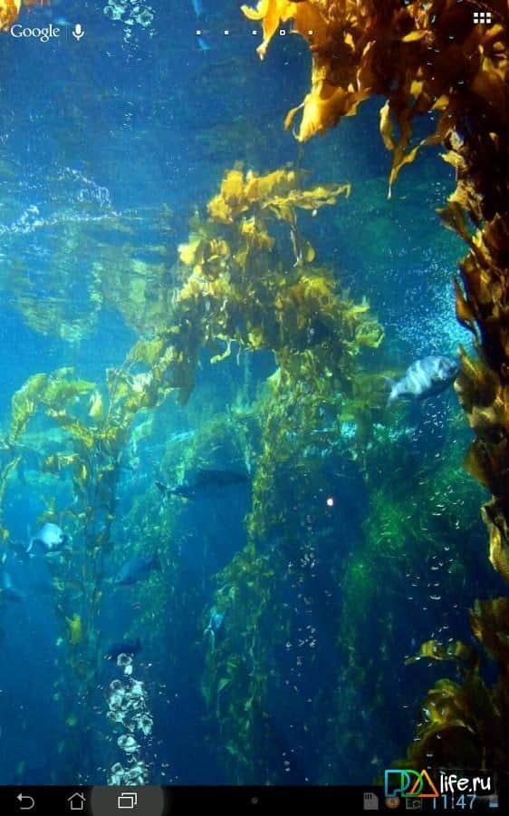 Under Water Scene HD – красивые обои для андроид, отражающие глубину и красоту водоема. Солнечный свет, лианы водорослей, рыбы, подводные родники и мелкие пузырьки, поднимающиеся с самого дна на поверхность водной глади. Из настроек анимации доступна только скорость пузырьков, в связи с этим данные обои практически не расходуют заряд аккумулятора вашего андроид устройства.
