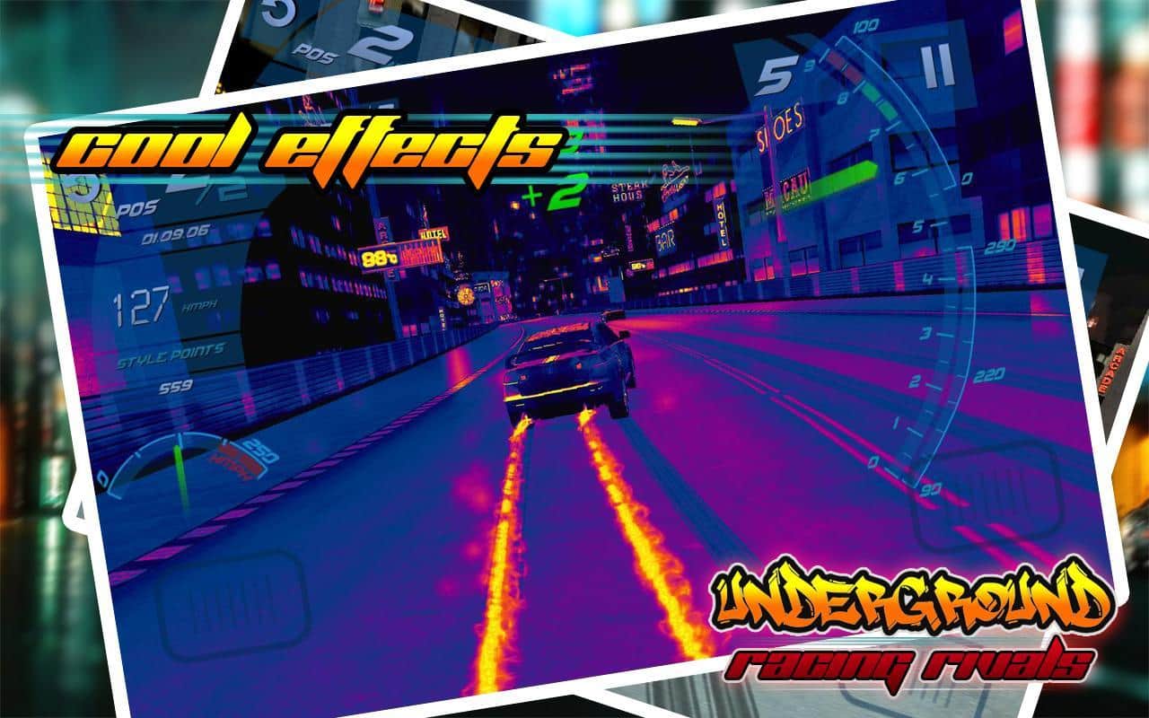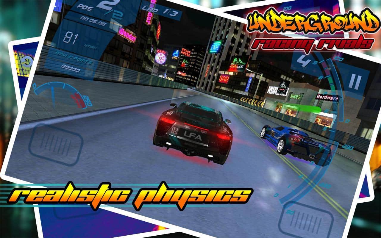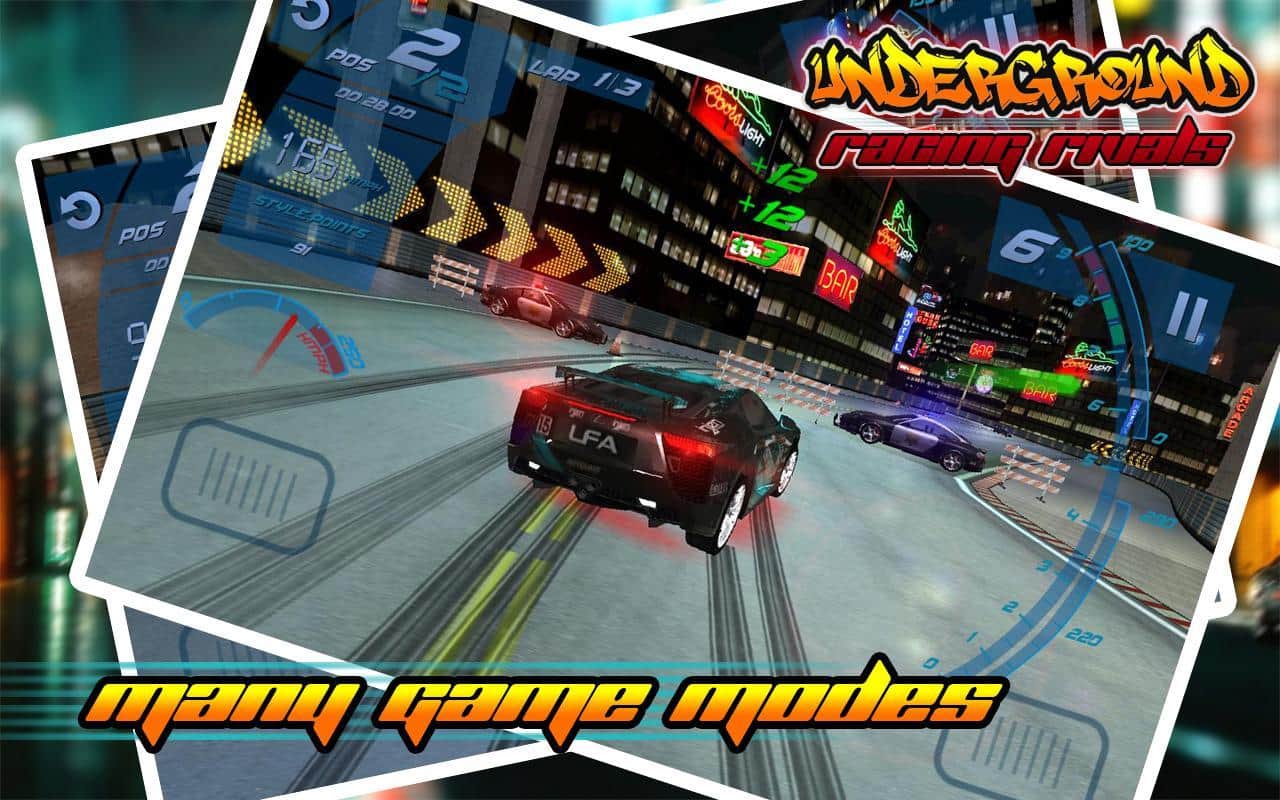 Underground Racing Rivals – бросьте вызов самым отважным гонщикам в этой игре и попробуйте прийти в финишу первым. Выберите подходящий вам автомобиль и гоняйте по оживленным трассам на огромной скорости обгоняя всех соперников. Прейдя к финишу первым вы заработаете деньги, накопив их достаточное количество вы сможет отправиться в магазин и приобрести новые обновления для авто или купить новый мощный автомобиль. Игра порадует вас реалистичными звуками мотора, отличным управлением и невероятным дрейфом на поворотах.