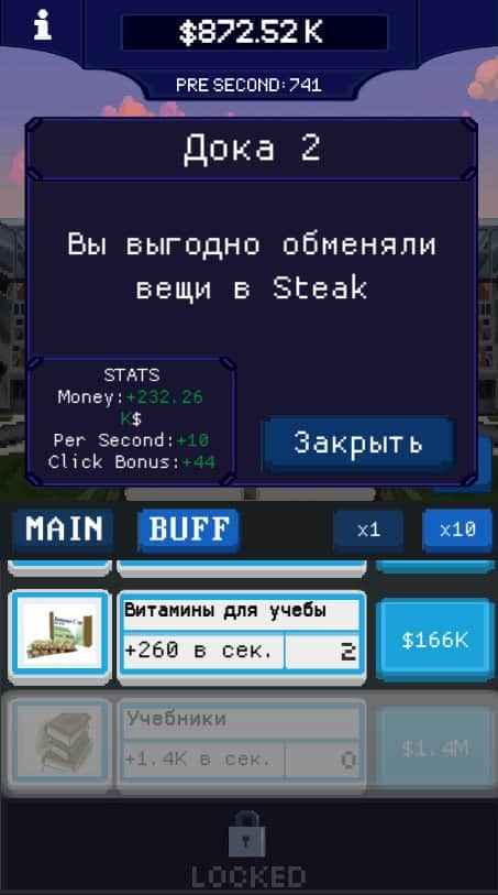 University Clicker – захватывающий кликер на андроид, где вы будете выступать в роли студента. Вы обычный студент и учитесь в ВУЗе, но к великому вашему сожалению учеба дается вам очень сложно. Единственный ваш шанс закончить университет это подкупить ректора. Единственное что вы хорошо умеете делать - это зарабатывать деньги. Кликайте как можно чаще на экран своего телефона или планшета и зарабатывайте деньги. Решайте непростые задачи, также каждый день с вами будут случаться различные события. Приобретайте на заработанные деньги улучшения и баффы и подкупите ректора.