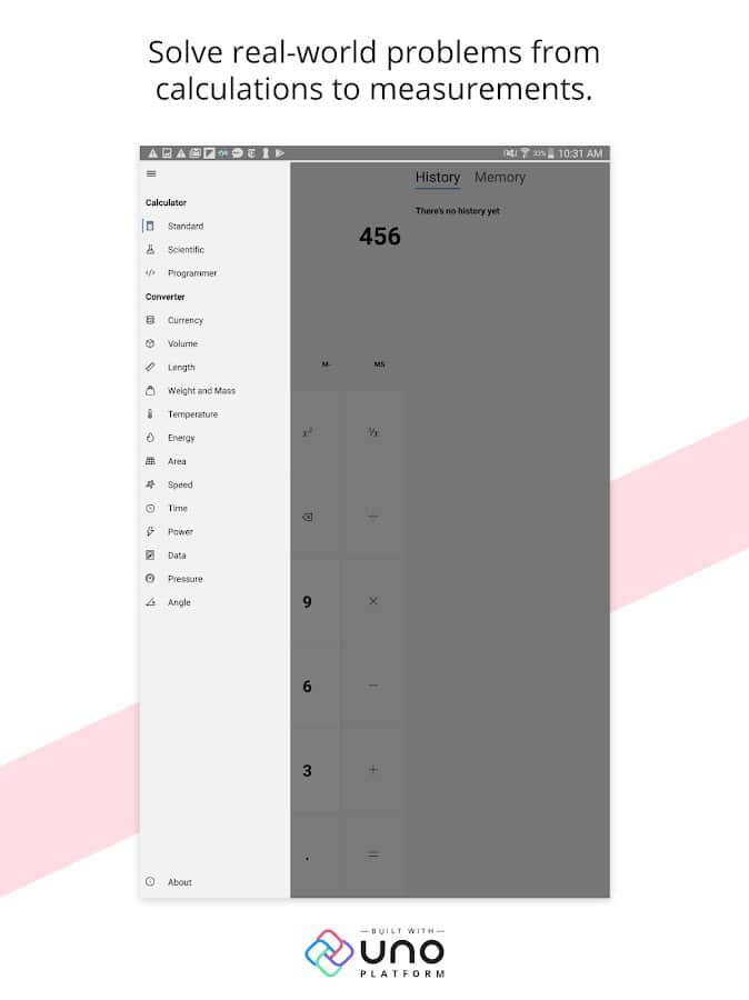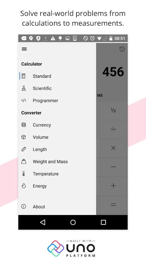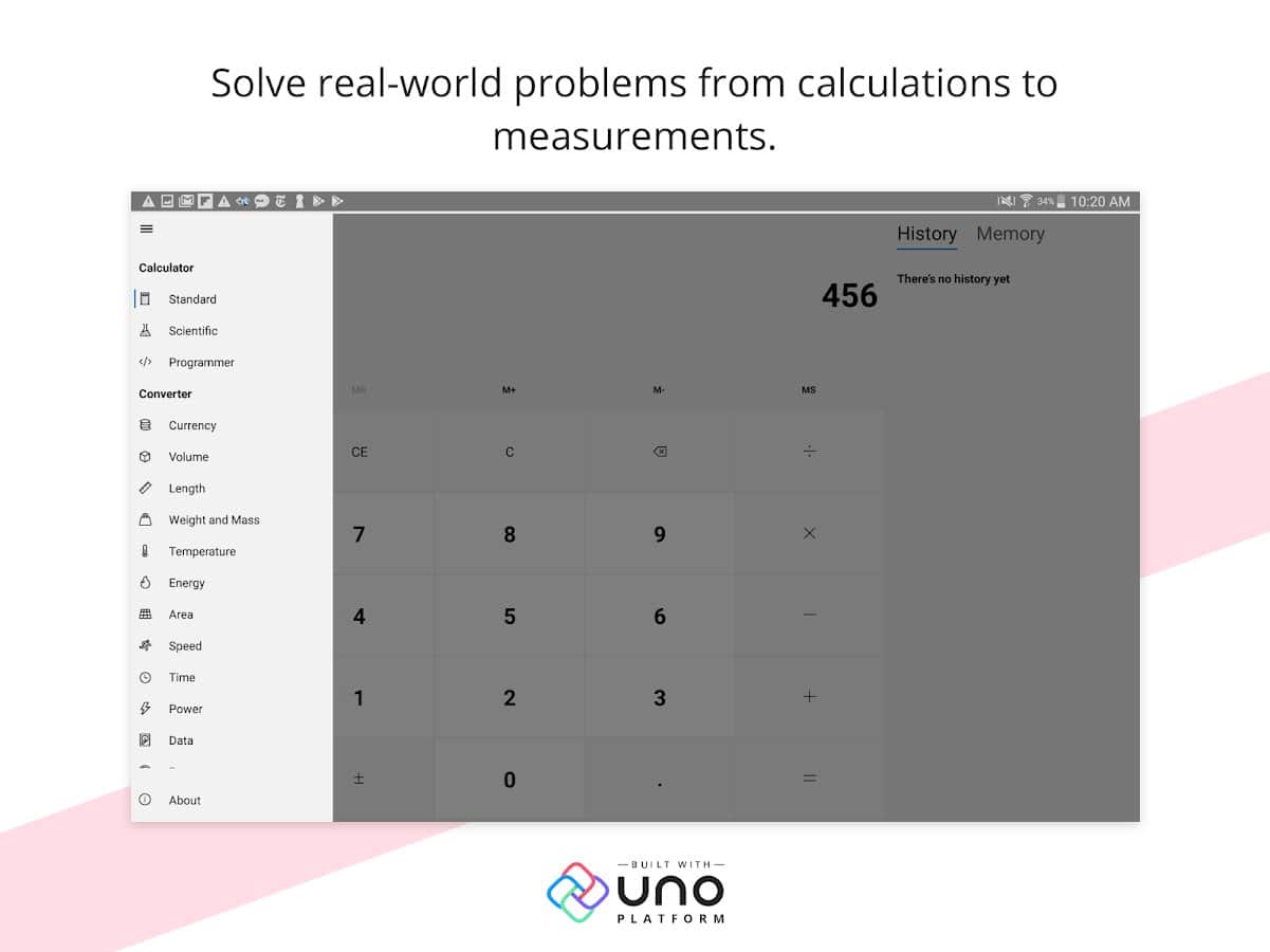 Uno Calculator - популярный калькулятора с ОС Windows который позволяет не только осуществлять любые вычисления, но и выполнять различные измерения, например температуры, скорости и другие. И так, перед нами полноценный инструмент для любых вычислений и измерений который был перенесен на мобильные платформы с полным функционалом. Не смотря на то что приложение находиться на стадии разработки Uno Calculator не вызывает нареканий у пользователей.