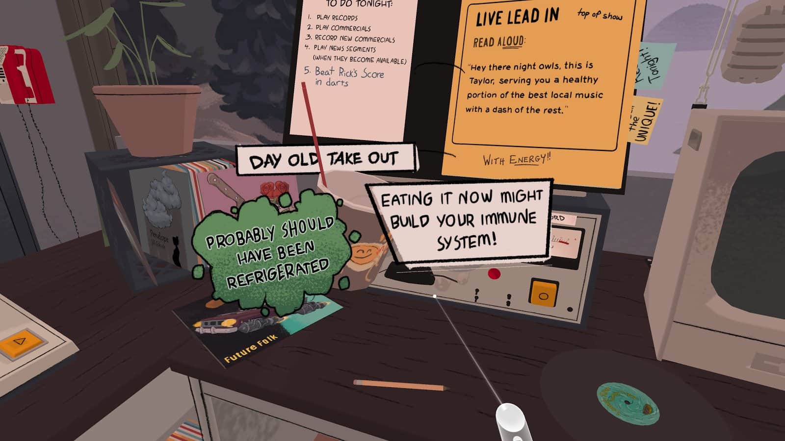 Untethered – игра на андроид, которая погрузит вас в виртуальную реальность. В этой игре с отличным сюжетом вы будете выступать в роли диджея, которому предстоит раскрыть тайну небольшого городка в штате Оригон. В игре вы окажитесь на небольшой радиостанции, где будете ставить пластинки, отвечать на вопросы радиослушателей, общаться в эфире и прослушивать голосовые сообщения. Исследуйте небольшое помещение в котором окажитесь и взаимодействуйте с предметами и объектами в нем, стараясь раскрыть все тайны и загадки. Играйте в эту игру от первого лица и наслаждайтесь стильной графикой и отличным звуком, а также используйте специальные очки VR.