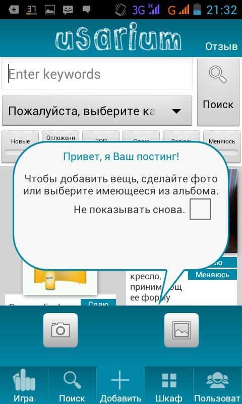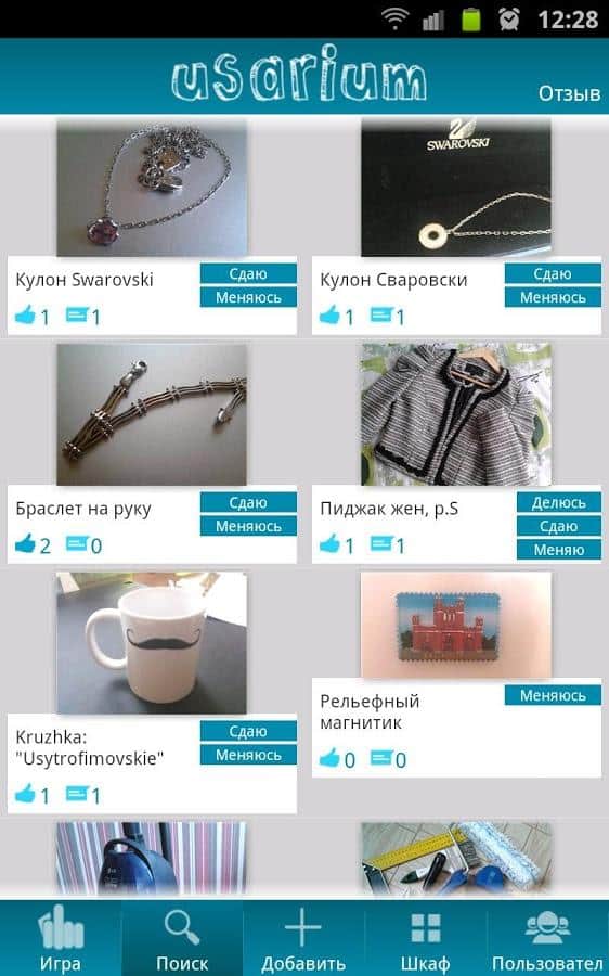Usarium позволяет выполнять все перечисленные действия на вашем смартфоне. Удобно. Выгодно. Безопасно. Сфотографируйте вещь на мобильный телефон, укажите условия, и ее увидят все ваши друзья, чтобы вы могли получить выгоду от использования простаивающих вещей. Когда вашими товарами кто-то заинтересуется, система поможет вам определить, кто этот человек и стоит ли ему доверять.