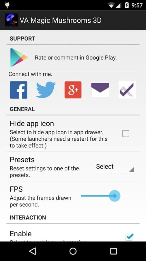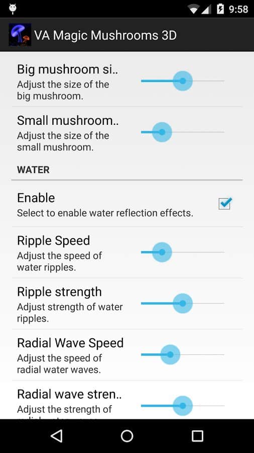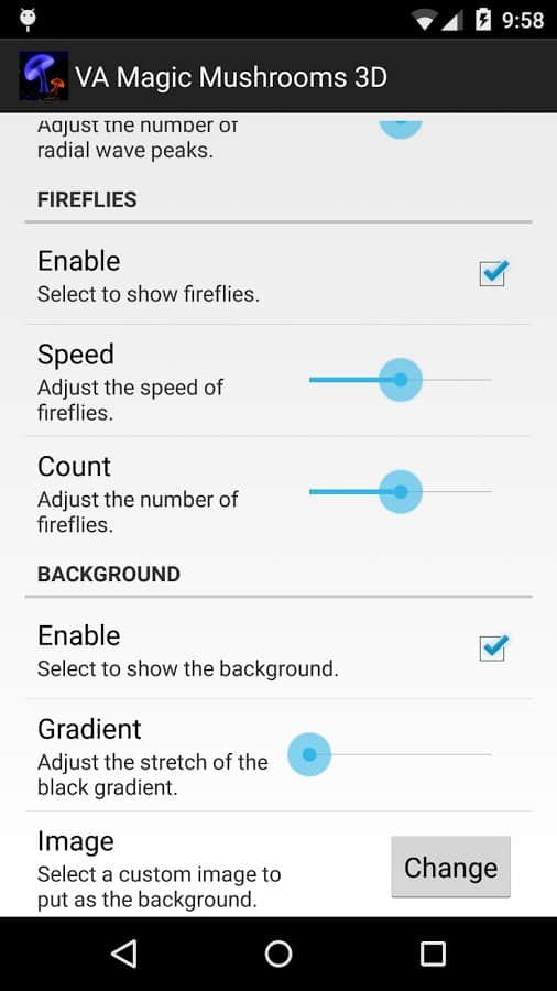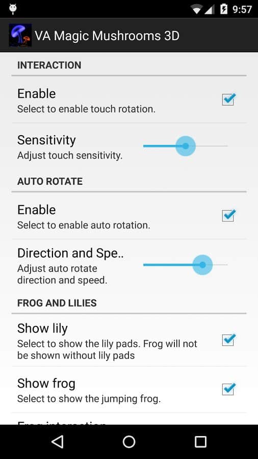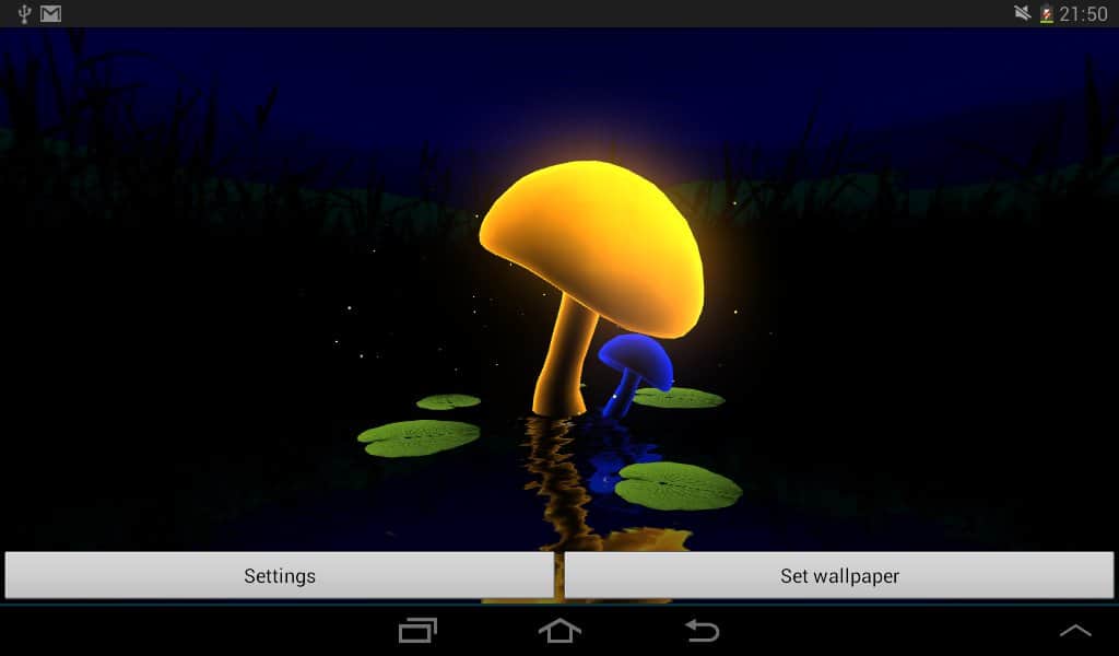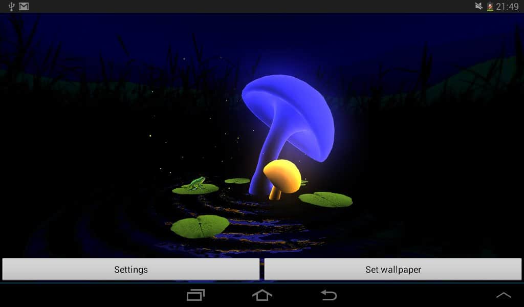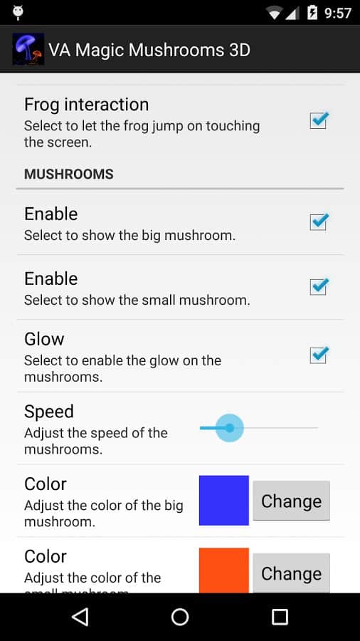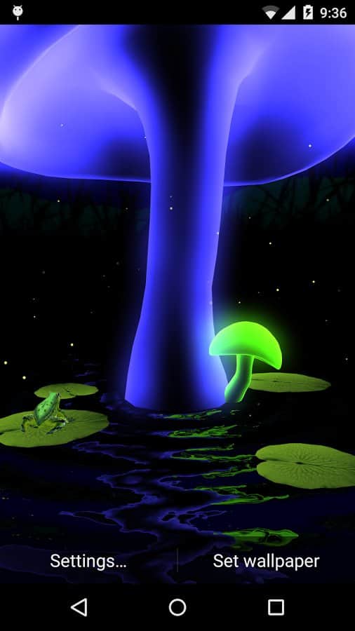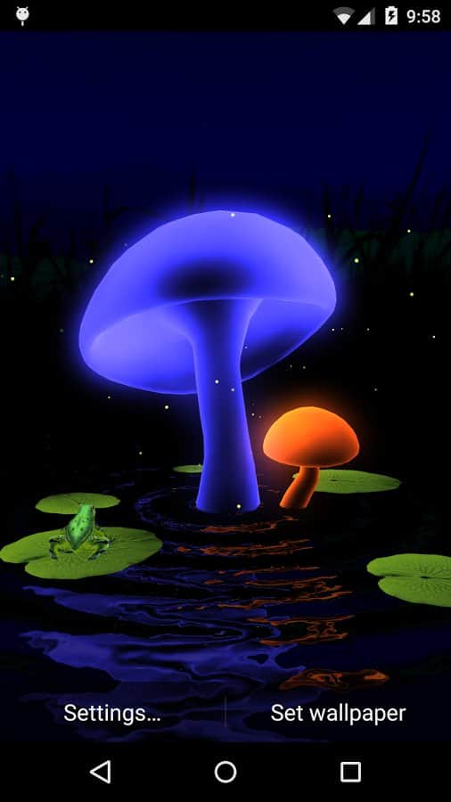 VA Magic Mushrooms 3D – отличные живые обои на андроид, где для вас откроется удивительный мир грибов. Обои выполнены в 3D графике с параллакс эффектами, где вы сможете наблюдать танцы грибов, вращая и наклоняя свой телефон или планшет меняя ракурс обоев. Живые обои порадуют вас множеством настроек, где вы сможете поменять цвет фона, скорость вращения, четкость экрана, а также посадить на пруд лягушек и лилии. Наслаждайтесь обоями и применяйте различные эффекты, которые порадуют вас своими красками и необычностью. Настаивайте обои по своему вкусу и делайте их уникальными.