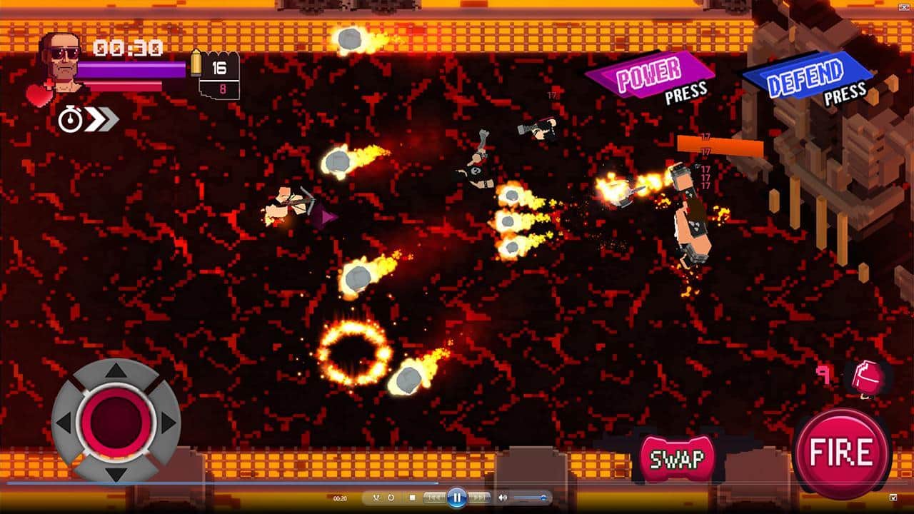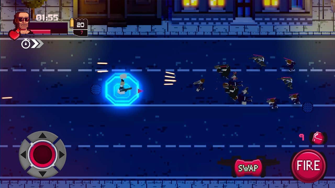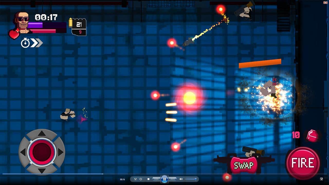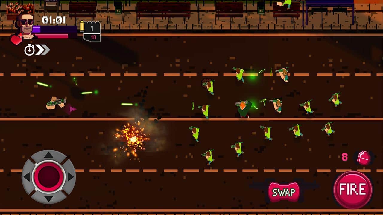 Vagrant Fury – шутер на андроид, сделанный в стиле 80-х и 90-х годов. В этой игре вы возьмете под свой контроль отважного героя и будете перемещаться по различным локациям, уничтожая злодеев-психопатов и устраивая взрывы. Уничтожайте многочисленных врагов поджидающих вас на каждом шагу и перемещайтесь по экрану, чтобы увернуться от огня ответных выстрелов. Играйте в эту игру в любое свободное время и весело проводите его, наслаждаясь динамичным саундтреком и пиксельной графикой.