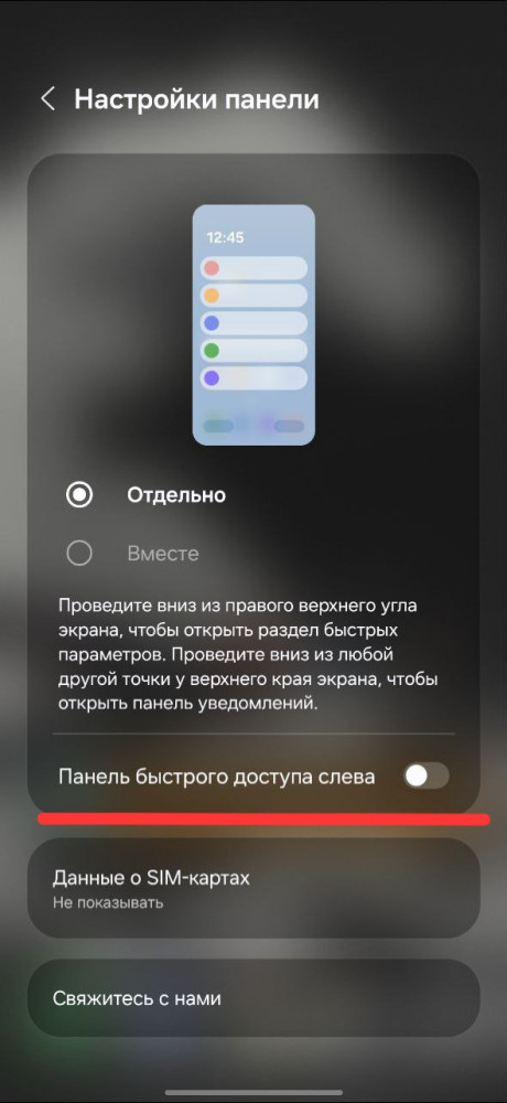 Для начала, переходим к шторке и нажимаем на ярлык “Изменить”, на следующем экране выбираем “Настройки панели” и здесь выбираем предпочтительный вариант: “Отдельно” или “Вместе”. Если вам нравится обновленная разделенная шторка, но не устраивает положение панелей, их можно поменять местами. Для этого активируем переключатель “Панель быстрого доступа слева”.