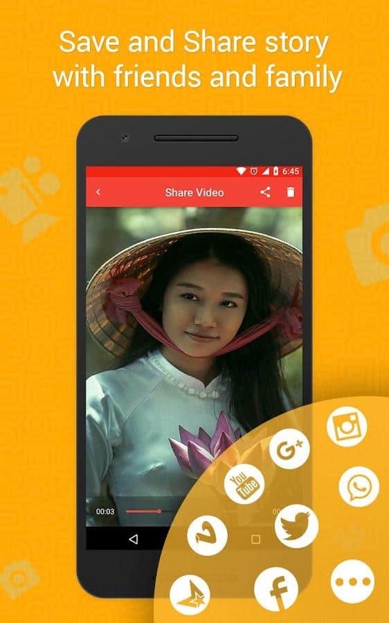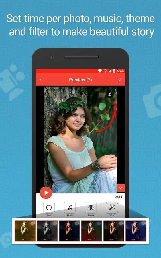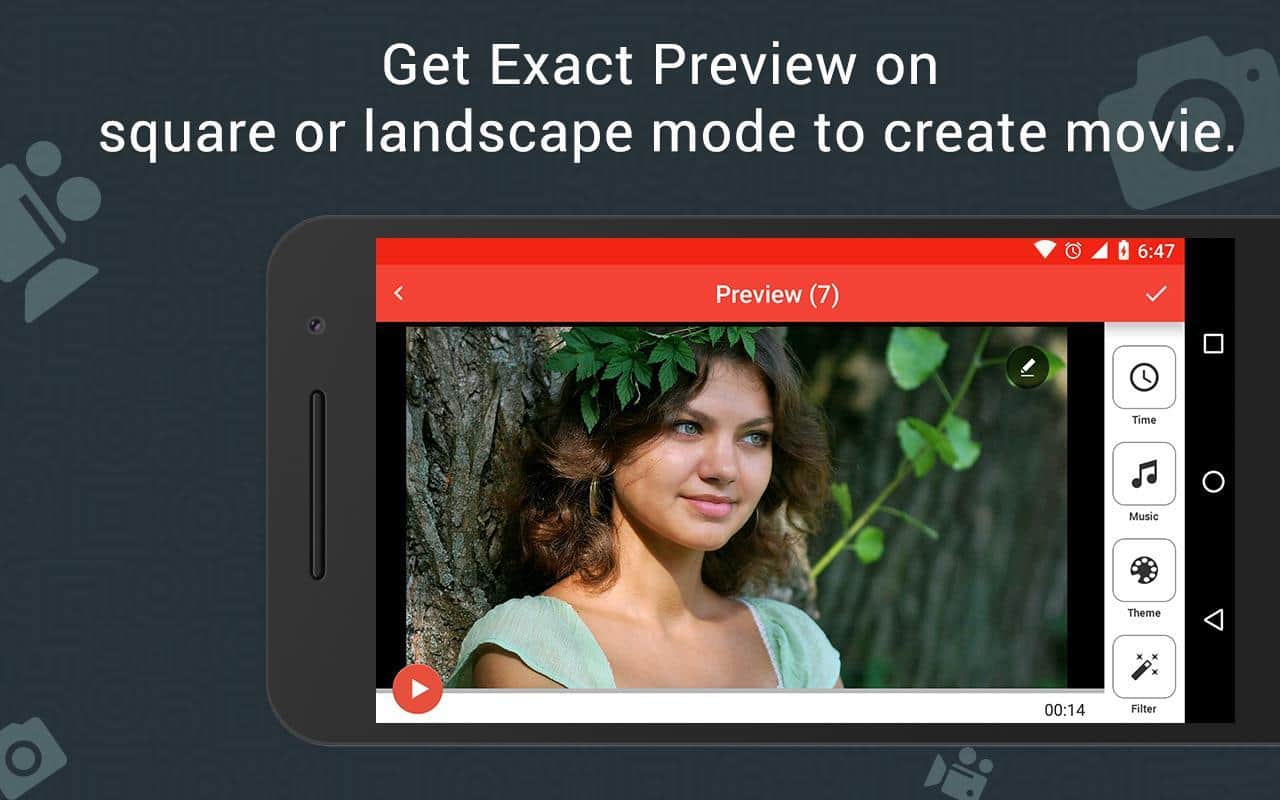 Video Maker - с помощью этого простого приложения вы сможете вдохнуть историю в свои фотографии, ведь оно создано для того что бы сделать из фото целую видео-ленту. Работает это приложение очень просто, вы выбираете нужное количество фотографий и оно создает из них видеоролик в котором эти фото будут чередоваться. Однако в отличии от других приложений в этом есть довольно мощный встроенный фоторедактор а значит вы сможете прямо при создании клипа изменять фото, добавлять им рамки или текст, менять некоторые настройки такие как яркость контрастность и другие.