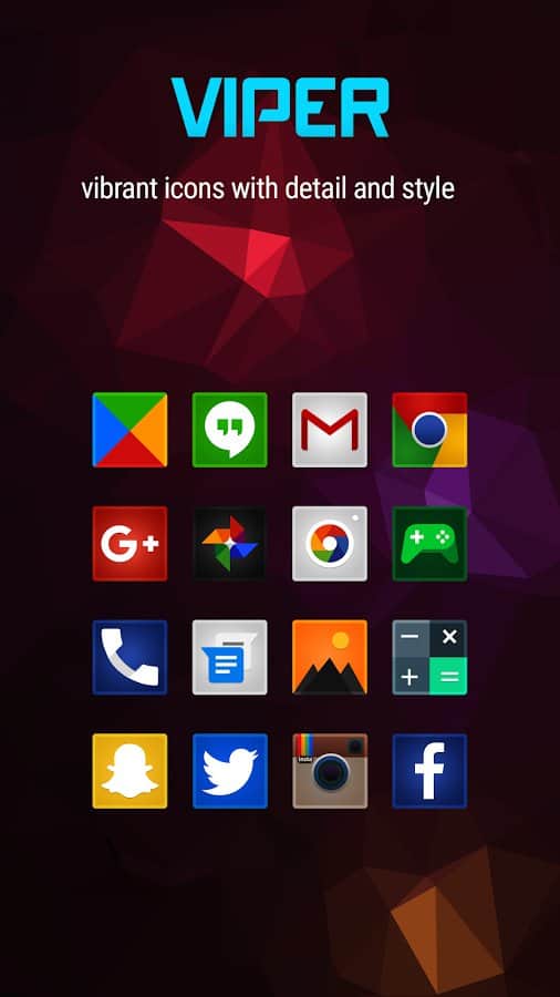 Viper Icon Pack - Разнообразие и качество, вот главный девиз этого приложения. Набор из более чем двух тысяч иконок, выполненных наилучшим образом и в очень простом стиле. Все они сделаны в виде квадратов, и хотя своими цветами очень напоминают оригиналы, имеют отличную картинку а так же высокое разрешение текстур. К тому же в комплекте с ними вы найдете десять прекрасных и в тоже время простых обоев, которые отлично дополнят набор.
