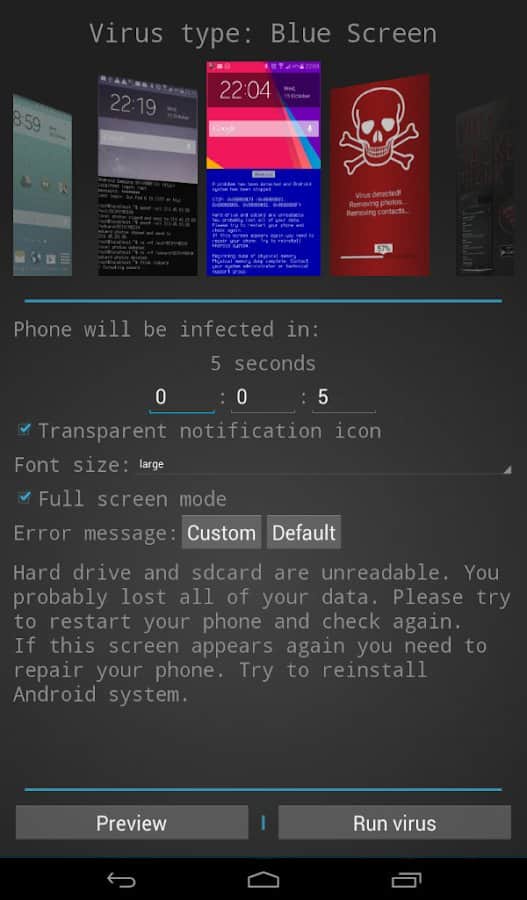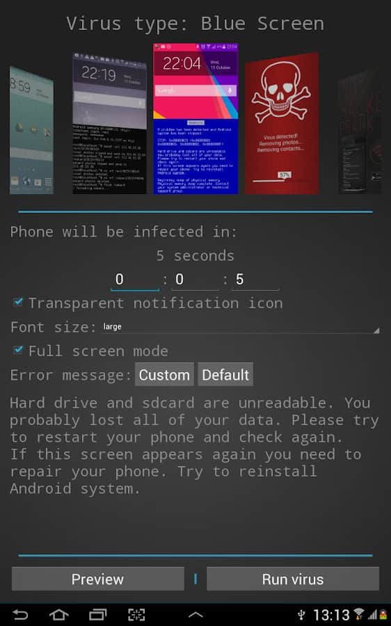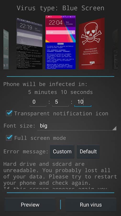 Отличное приложение с помощью которого, ты сможешь смешно подшутить над своими близкими и друзьями. Приложение НЕ представляет реальной угрозы для мобильного девайса! Virus Maker prank работает по принцепу будильника, только вместо звонка будет запускаться шуточный вирус, который можно легко отключить встряхнув девайс.