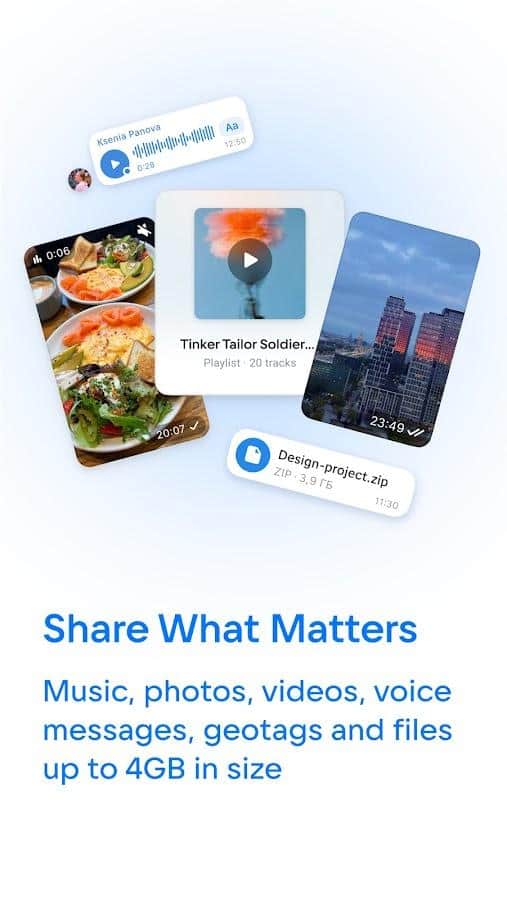 Обмен файлами: Отправляйте фотографии, видео и документы любого формата и размера.