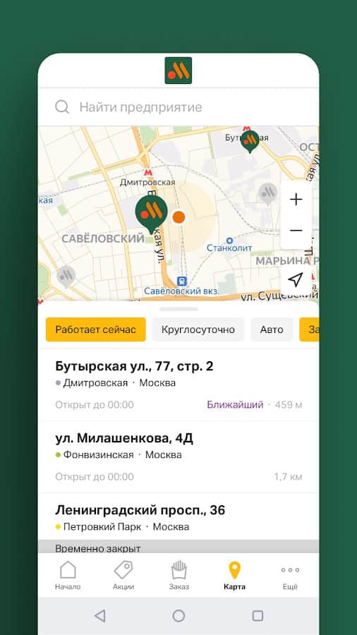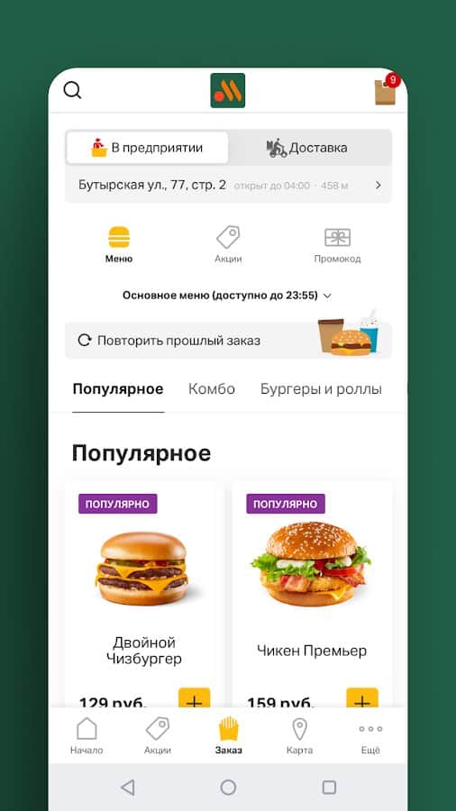 Делайте заказы еды в одном месте, а потом отслеживайте их в удобном мобильном приложении! Получайте самые актуальные и персонализированные акции благодаря собранным бонусам, которые доступны только внутри приложения и нигде больше. При заказе вы самостоятельно можете выбрать способ получения (с собой, доставкой, за столом, на парковке или на авто) и соответственно метод оплаты, учитывая способ. Посмотрите на ближайшие заведения с помощью карты и автоматически проложится маршрут до указанного места.