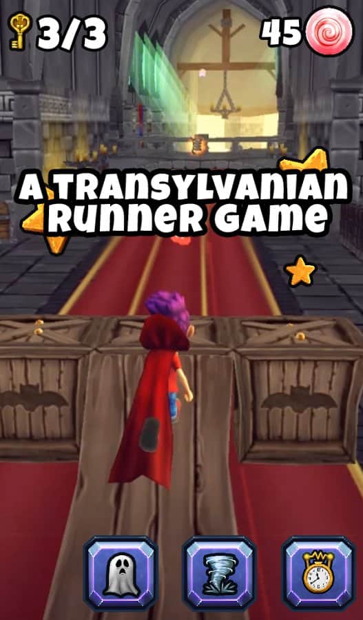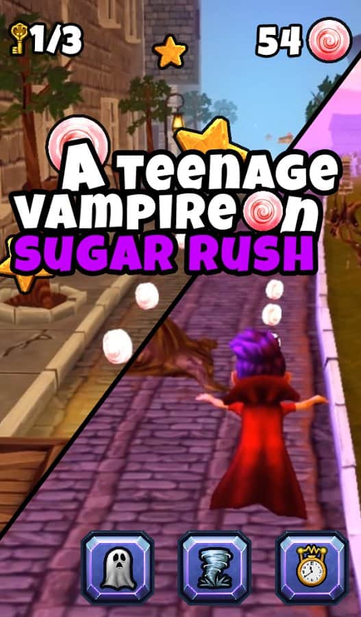 Vlad's Vampire Dash – раннер на андроид, где вы будете помогать вампиру собирать как можно больше сладостей. Наш герой вампир Влад бегает по многочисленным улицам Трансильвании, Лондона и другим городам и собирает сладости, помогите ему в этом. Перемещайтесь по старым кладбищам, заброшенным замкам и извилистым дорогам и соберите как можно больше конфет. Герой будет бежать безостановочно, и вы должны направлять его так чтобы он собирал все конфеты на пути и многочисленные бонусы. Лавируйте из стороны в сторону и обходите все преграды на пути, а также применяйте многочисленные бонусы и усиления.