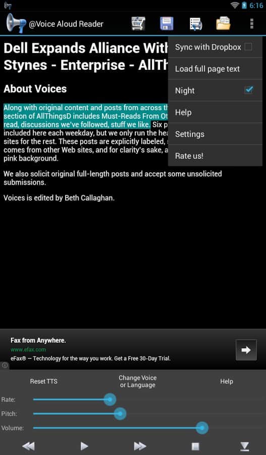 - Синхронизация с Dropbox! Разрешите синхронизацию, затем создайте список на одном устройстве, например на планшете, после чего слушайте его на телефоне. Либо в браузере на компьютере в меню "Файл/Сохранить как" выберите тип "Веб-страница, только HTML", сохраните документ в Dropbox-папке @Voice, после чего его можно будет слушать в телефоне.